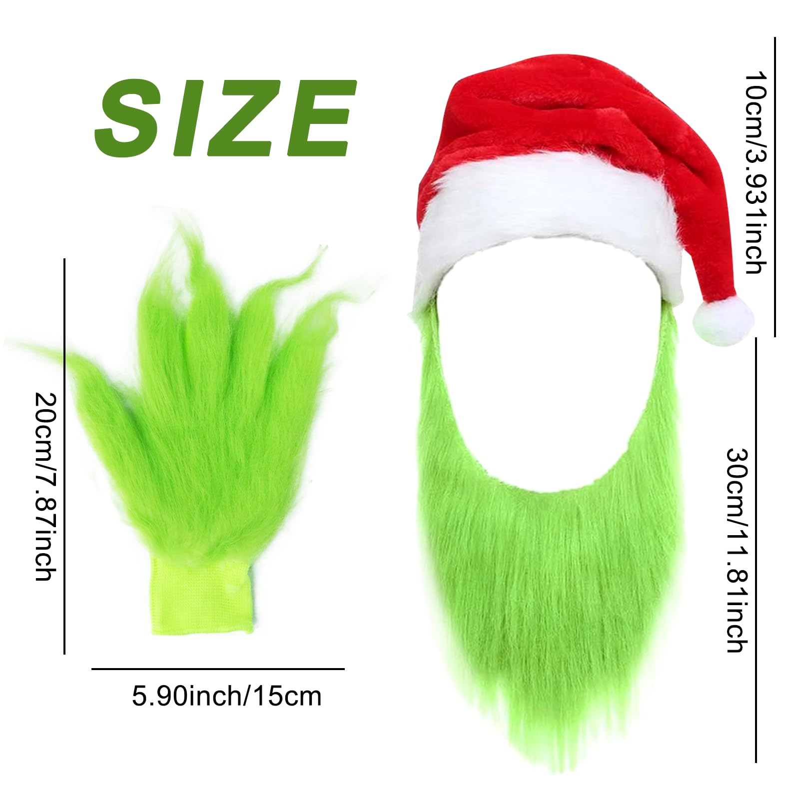 - Generous Sizing: The Santa hat measures 14.6 x 11.4 inches, the green beard is 11.8 x 7.9 inches, and each glove is 8.7 x 3.9 inches, ensuring a comfortable fit for most adults and teenagers, making it a great addition to any Grinch outfit.