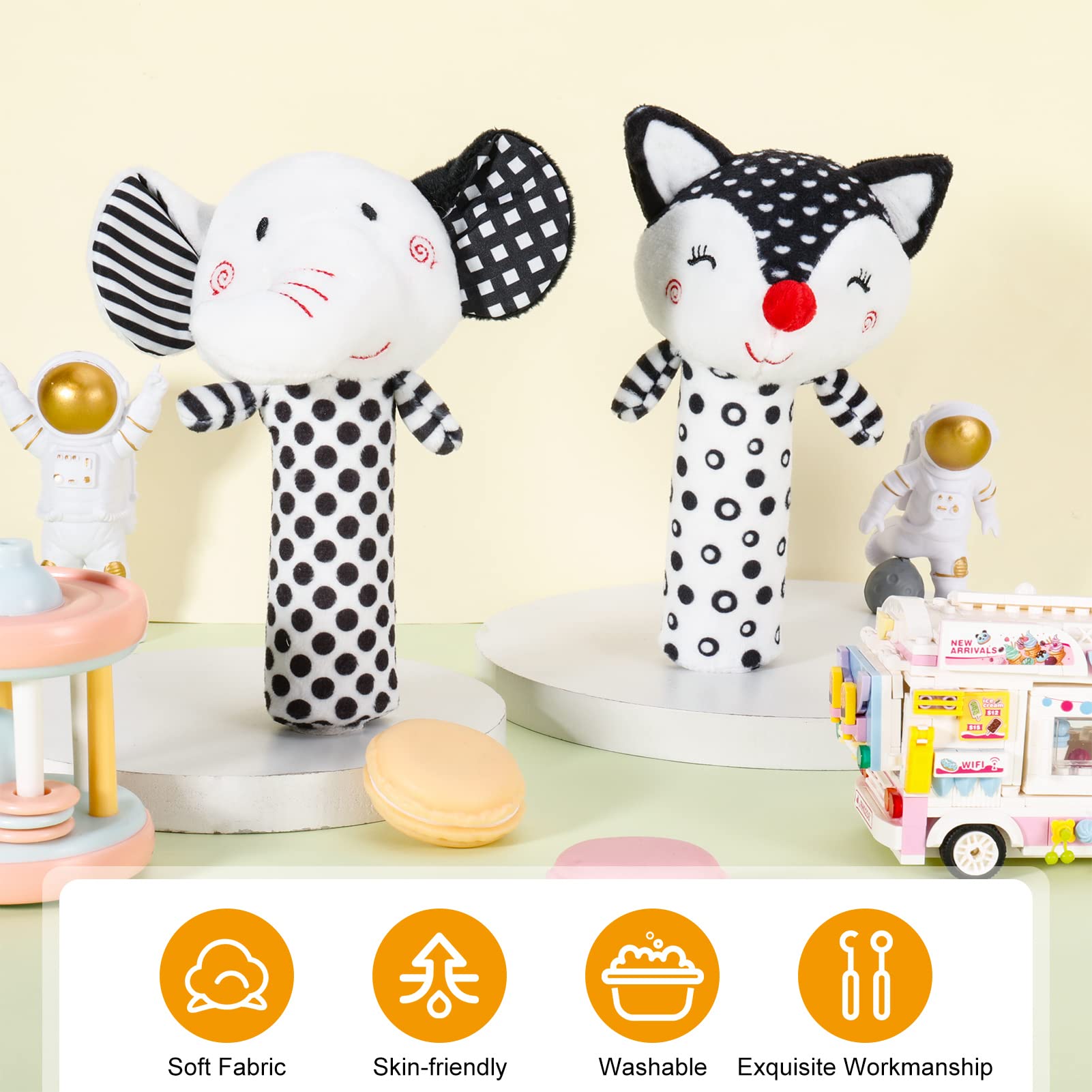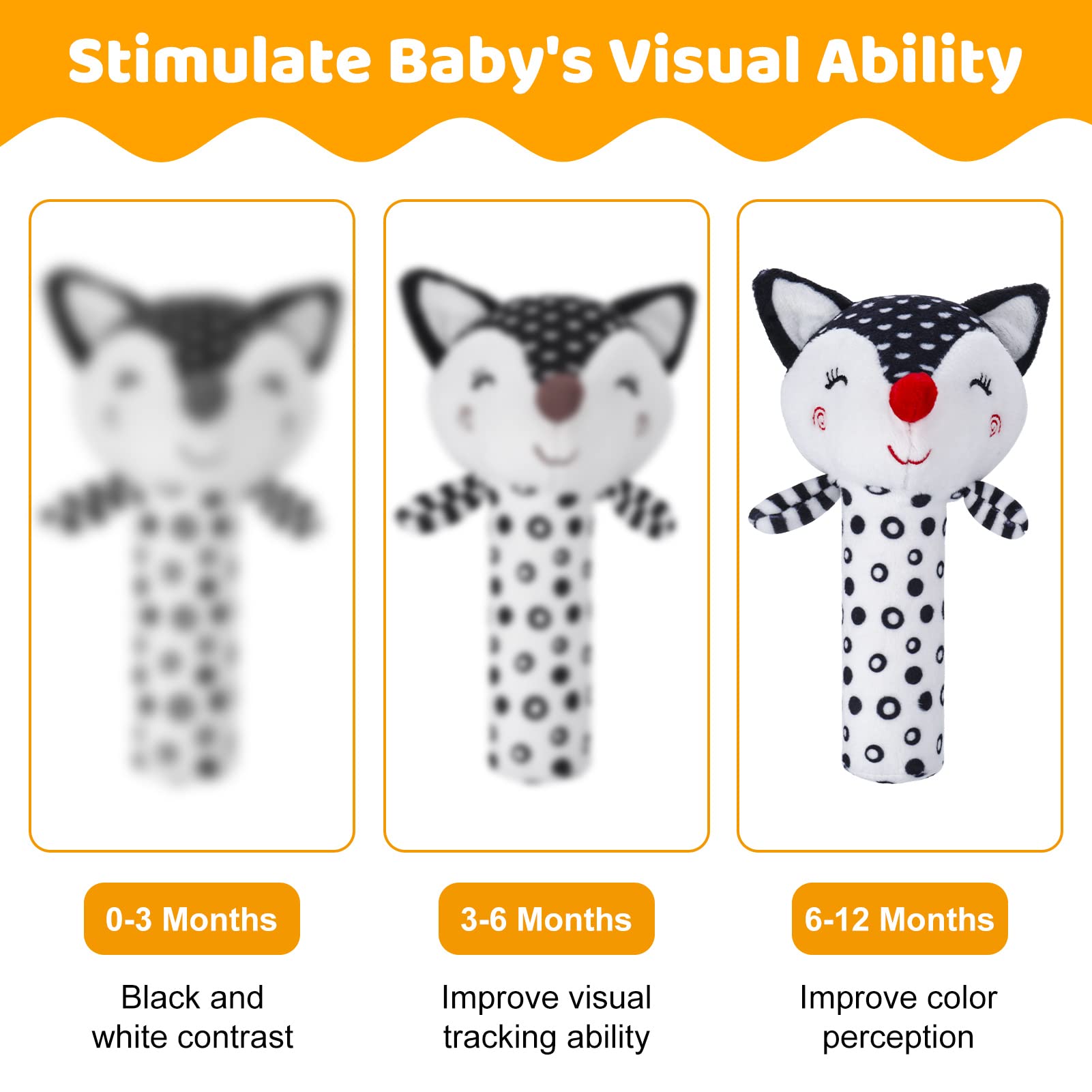 - Baby Sensory Toys: Black and white sensory toys can visually stimulate the baby, stimulate the baby’s vision of objects, promote the rapid development of the visual nervous system and brain, and improve the baby’s intelligence