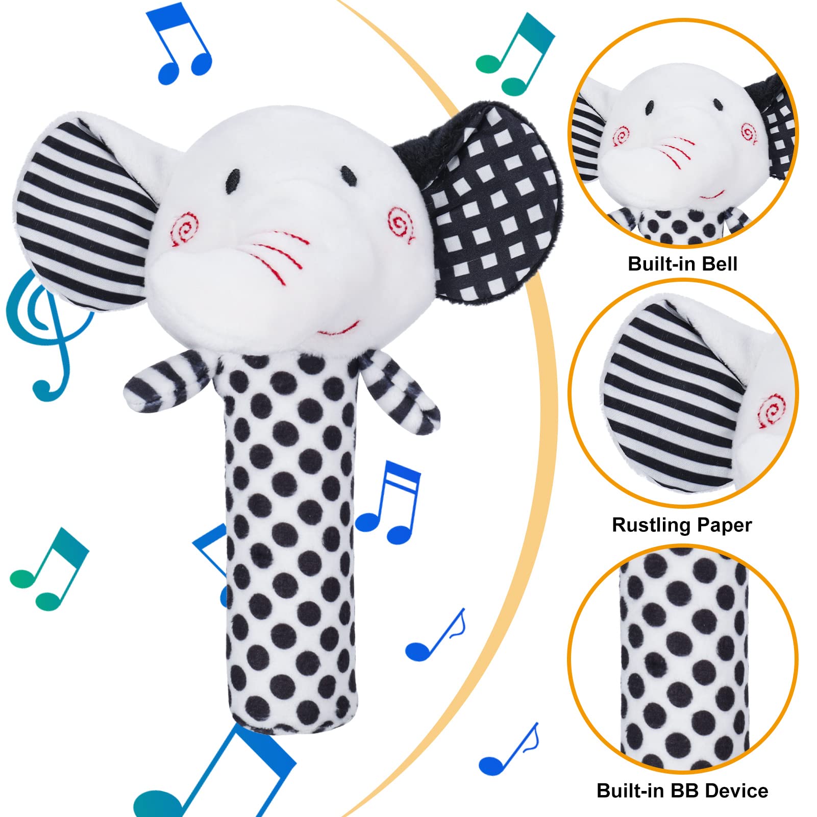 - Early Education Toys: Baby rattle toy has a cute animal shape and animal ears with rustling paper that will make sounds when pinched, promote baby’s auditory development and perception, attract baby’s attention