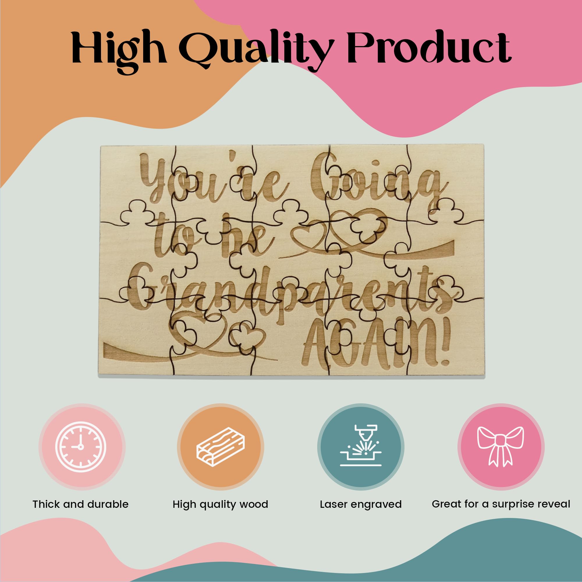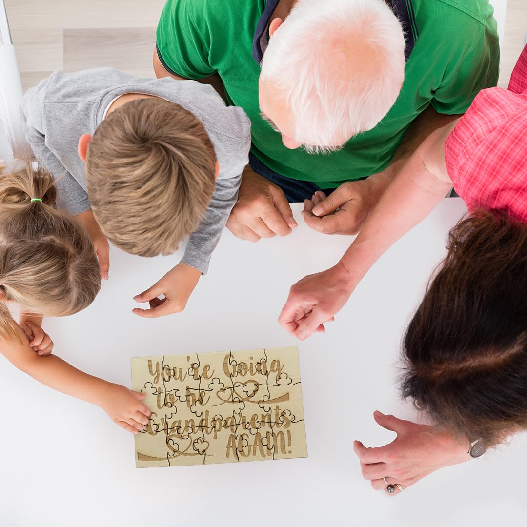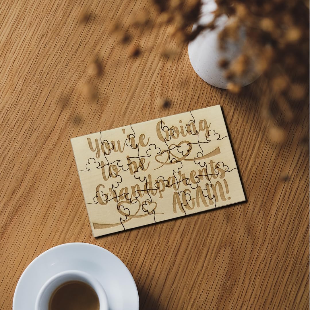 This puzzle is great way to tell the grandparents about another pregnancy! Let them build it and read the surprise! Puzzle is made of basswood, grain color will vary on each piece. Because it is laser engraved, the writing will not fade. Measures 6in x 3.5in and includes 15 pieces. After the big reveal, you can use a wood glue to glue the pieces together and frame it next to a picture.