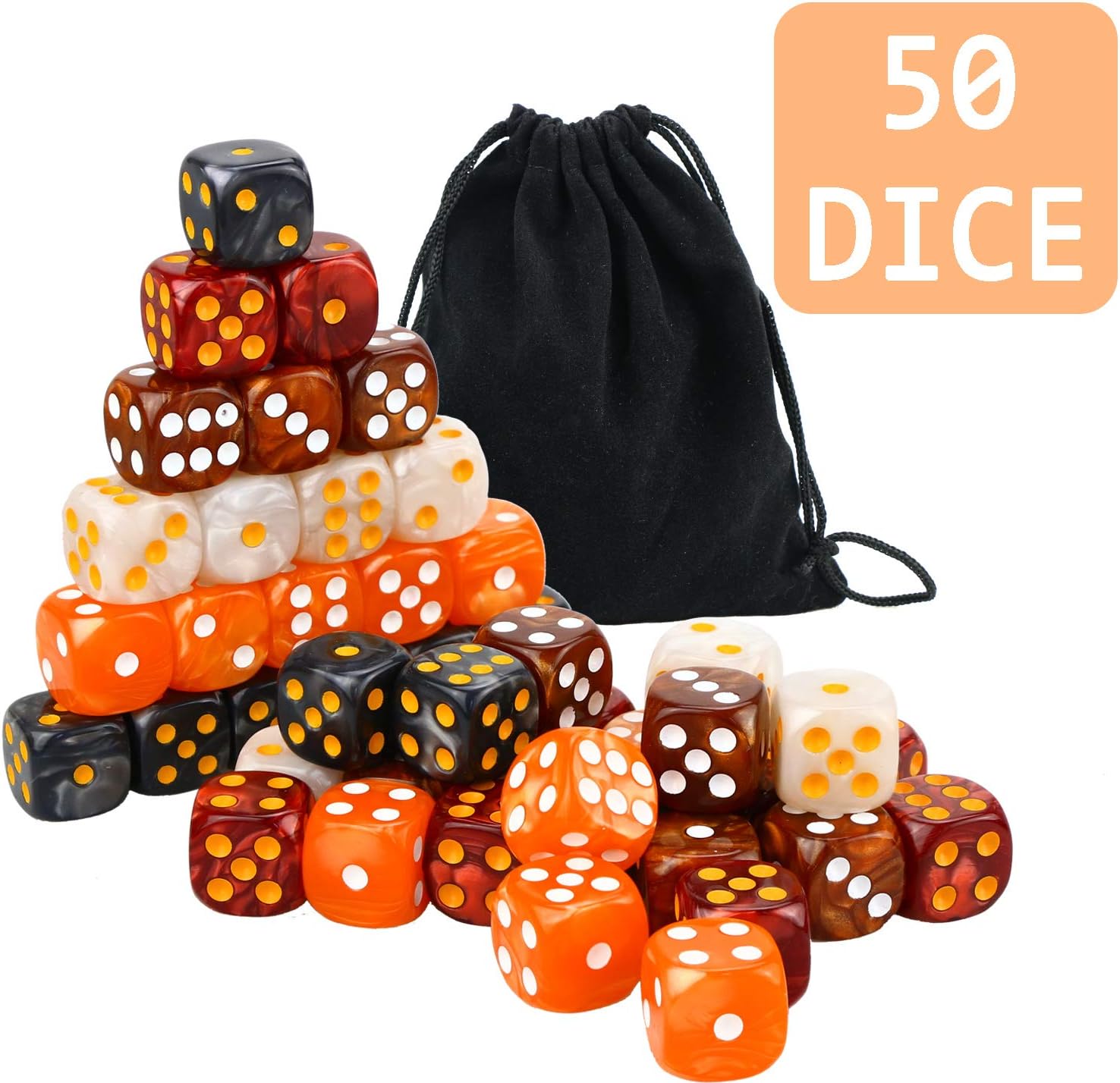 - Package – 50 pieces of standard 6-sided dice in 5 Pearl colors, with 10 pieces for each color.