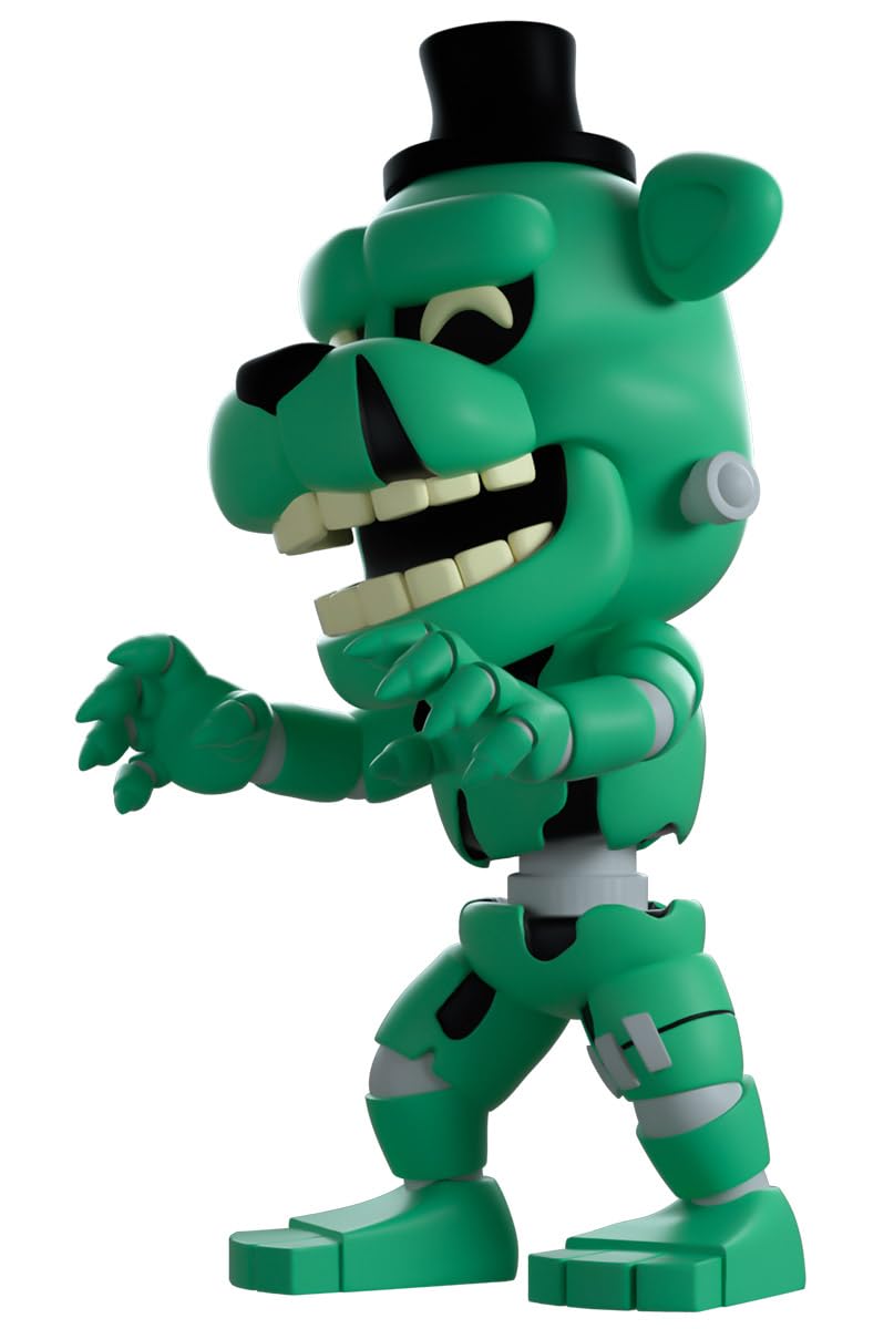 - Youtooz FNAF Dreadbear Vinyl Figure: Lurching forward at 4.8 inches tall with Dreadbear clawed hands stretched out and a tarnished smile stretched across Dreadbear jolly face, a small black tophat sits atop Dreadbear head and thick eyebrows as pointed ears stick out to the sides. Wearing a small black bowtie with a dilapidated green animatronic body that has a one in six (1-in-6) chance of being a chase glow in the dark version, segmented limbs that reveal a metal endoskeleton reach down to sturdy feet.