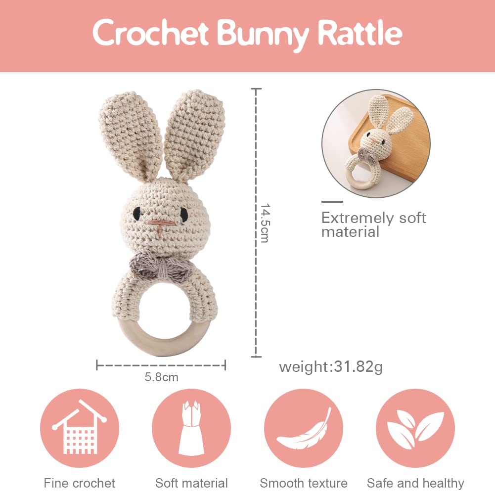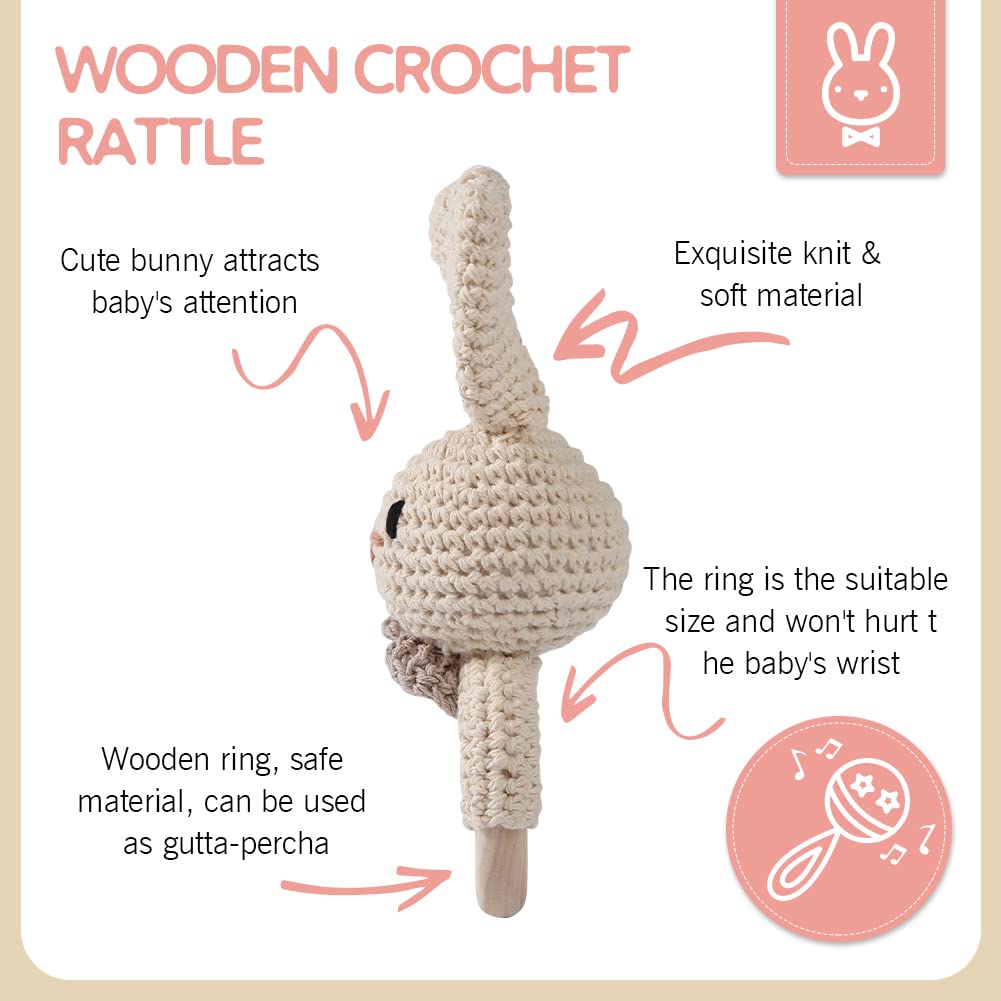 Youuys Baby Rattle Wooden Crochet Animals Grasping Toy Baby Wooden Rattle Baby with Sound Handmade Rattle for Newborn Baby Gift Boy and Girl Gift for Birth(Rabbit)