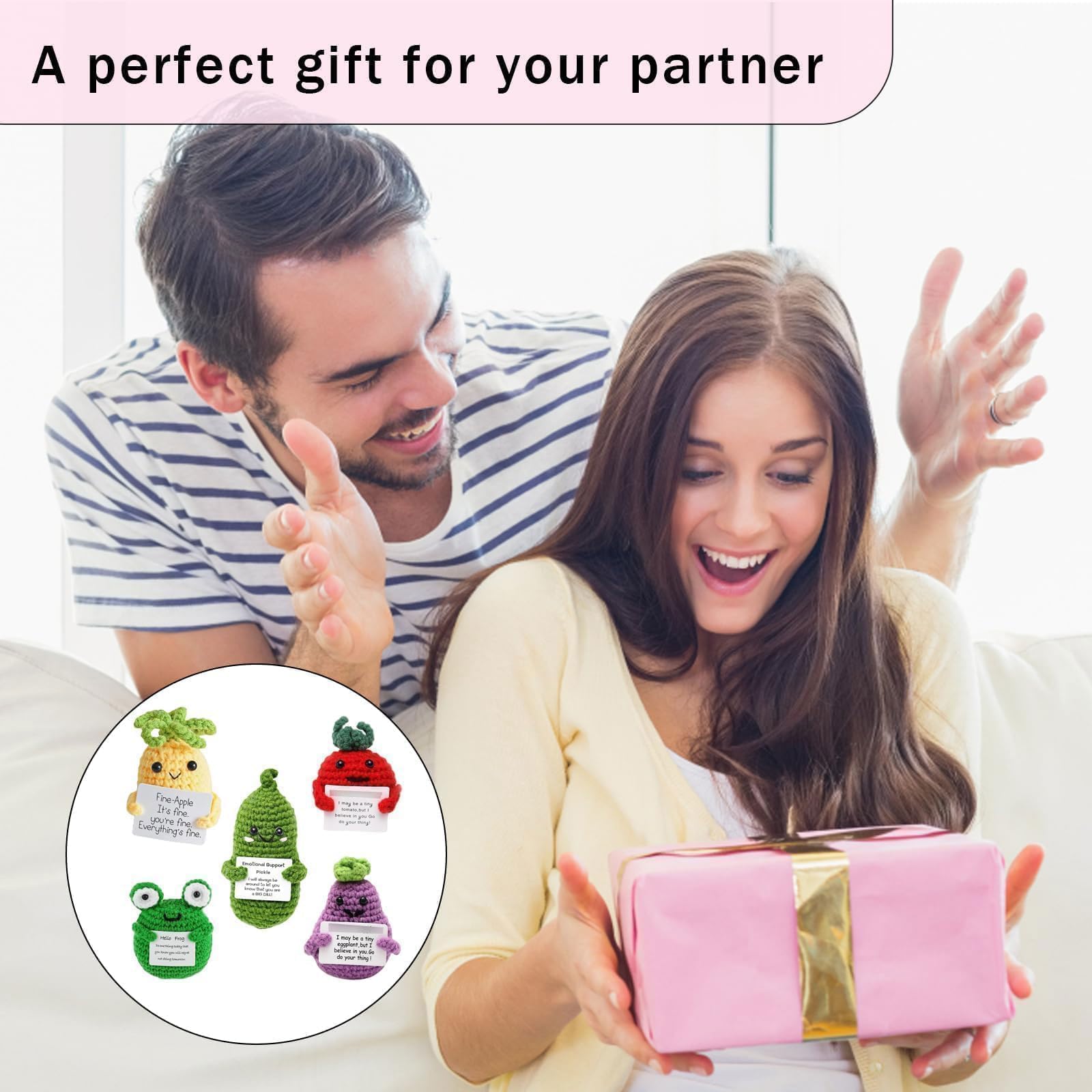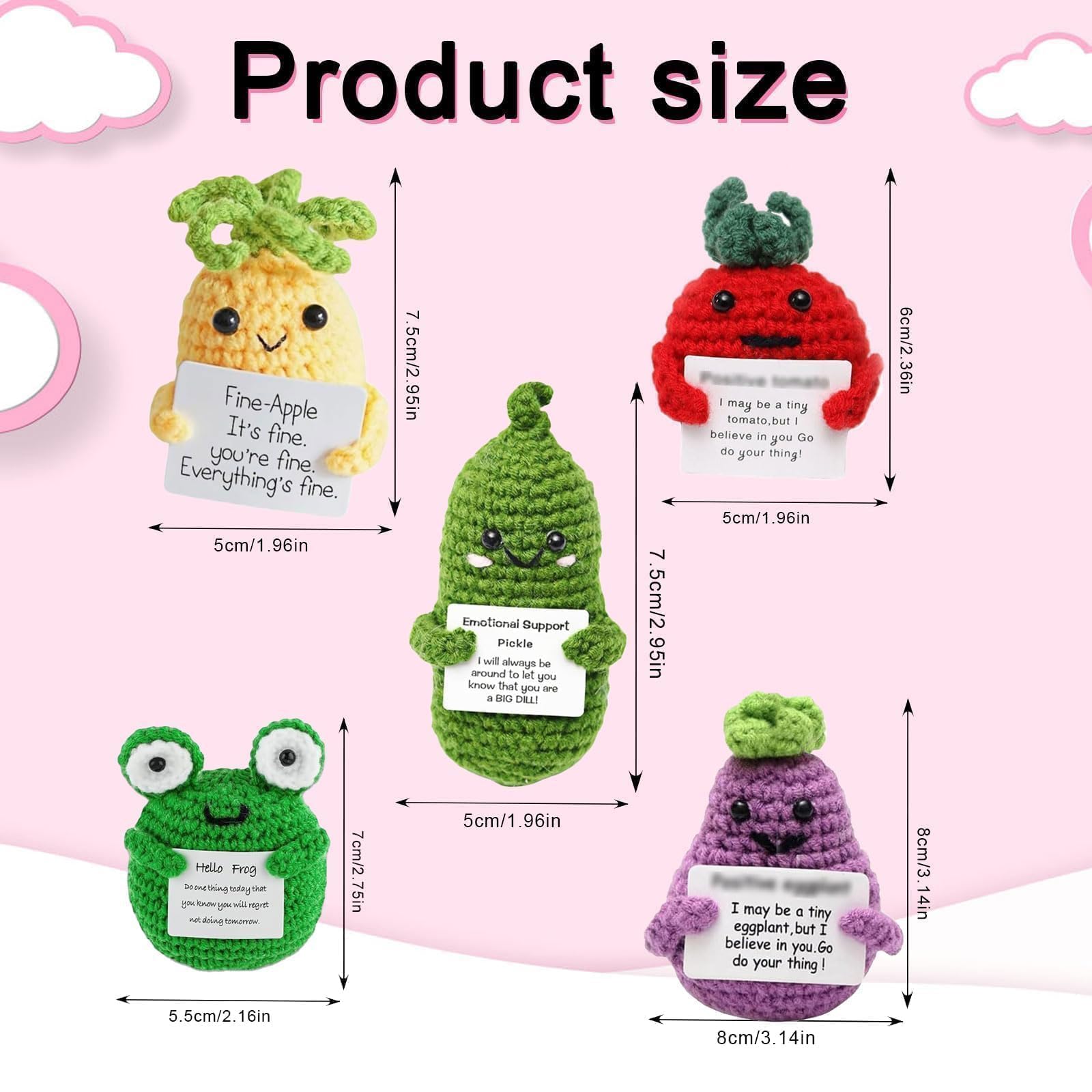 - Package Contains: Knitted toys contain cucumber, mini tomato, frog, eggplant and pineapple one of each. Positive tomato will motivate when you’re upset and make you happy. Emotional support plant will accompany you forever.