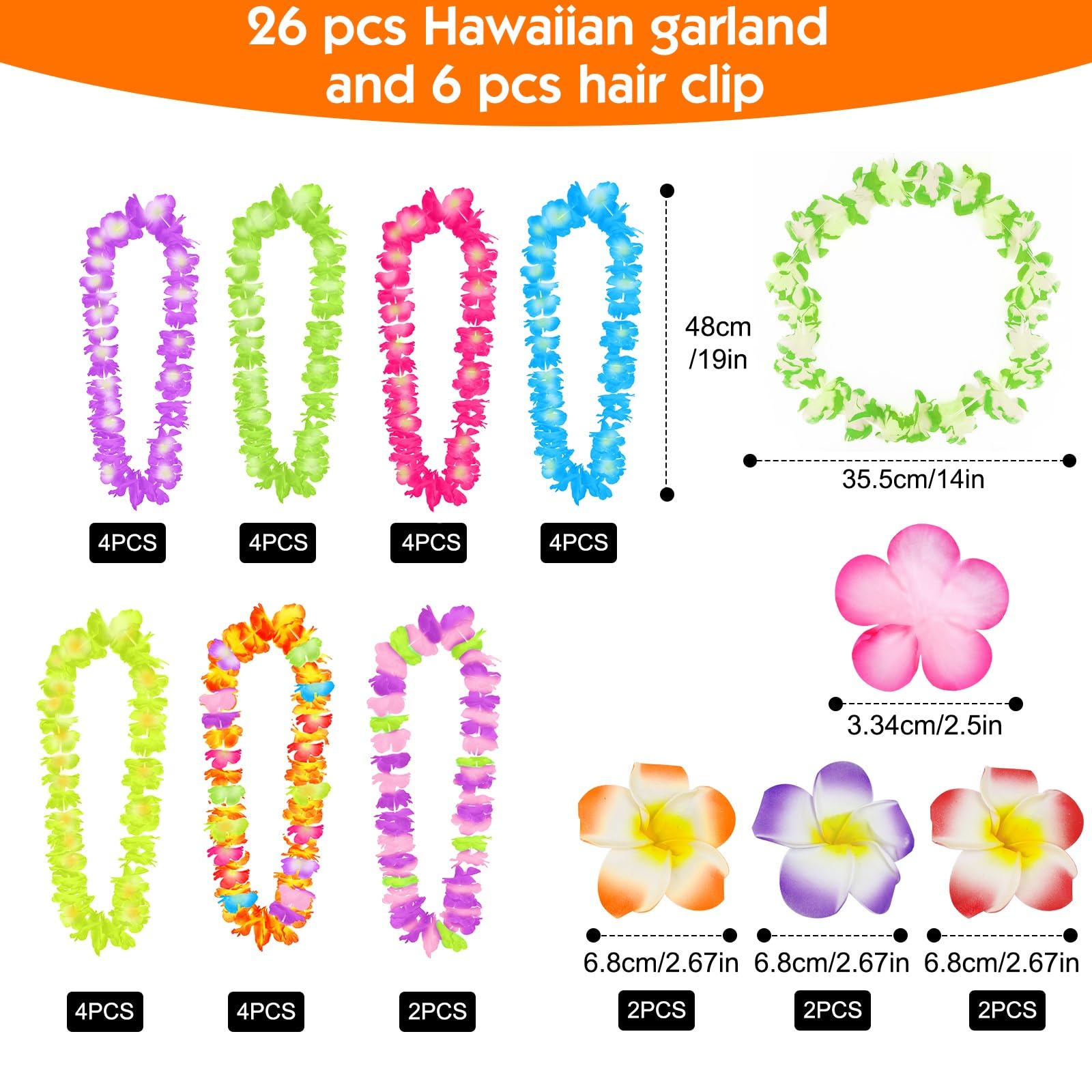 - Hawaiian Garland Set: There are 26 pieces of Hawaiian Luau Leis necklaces in each set, a total of 7 wreaths in different colors, and 6 flower hair cards, which is enough in the quantity that it can be used by multiple people at the same time