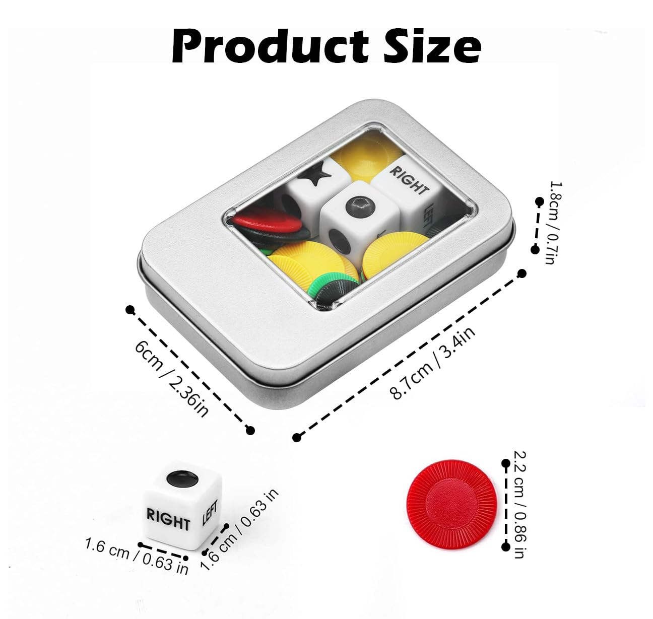- Package Content: You will receive 3 pieces of dices, 40 pieces of colorful chips (in 4 colors, including red, green, yellow and black), a game instruction and a metal storage case with clear window. They are enough for left right center game.