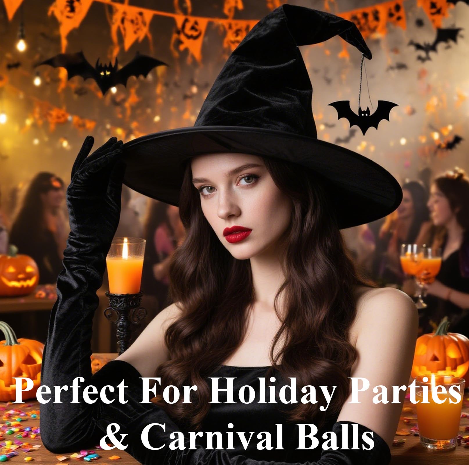 Enhance your witch costume with this elegant 2-piece set, featuring a crushed velvet witch hat and a pair of black gloves. The witch hat is designed with a wired brim to maintain its shape and is adorned with a bat charm for an authentic look. The black gloves are made from soft, stretchable fabric for comfort and ease of movement. Perfect for Halloween parties, cosplay events, and theatrical performances, this set is a must-have for any witch costume enthusiast.