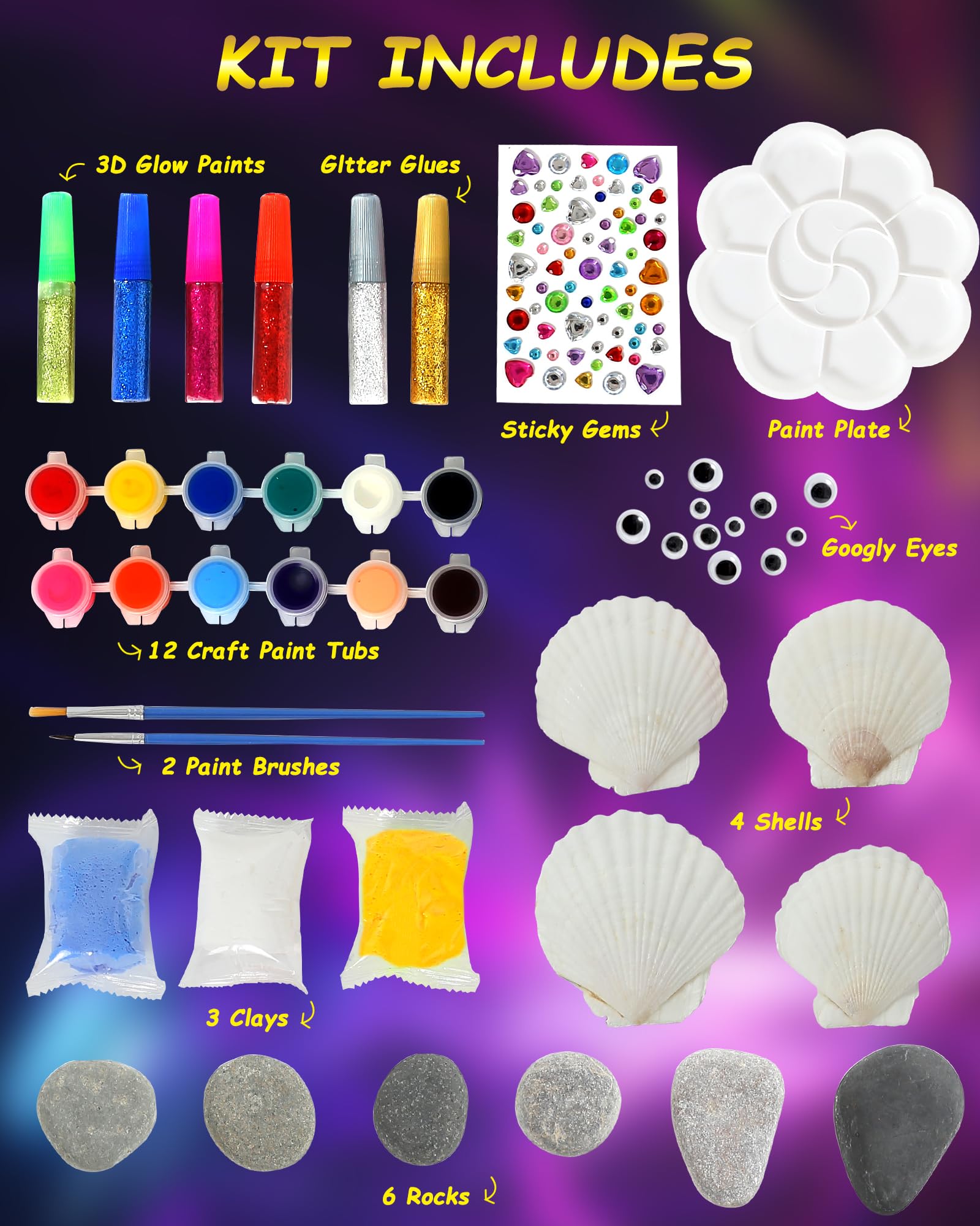 - Comprehensive Craft SetThis DIY craft rock & shell painting set includes 6 rocks, 4 sea shells12 standard paint tubs, 4 3D glow paints, 2 Glitter Glues, 2 brushes, 12 Amusing Wiggly eyes, 3 clays, Sticky gems, and a paint plate.