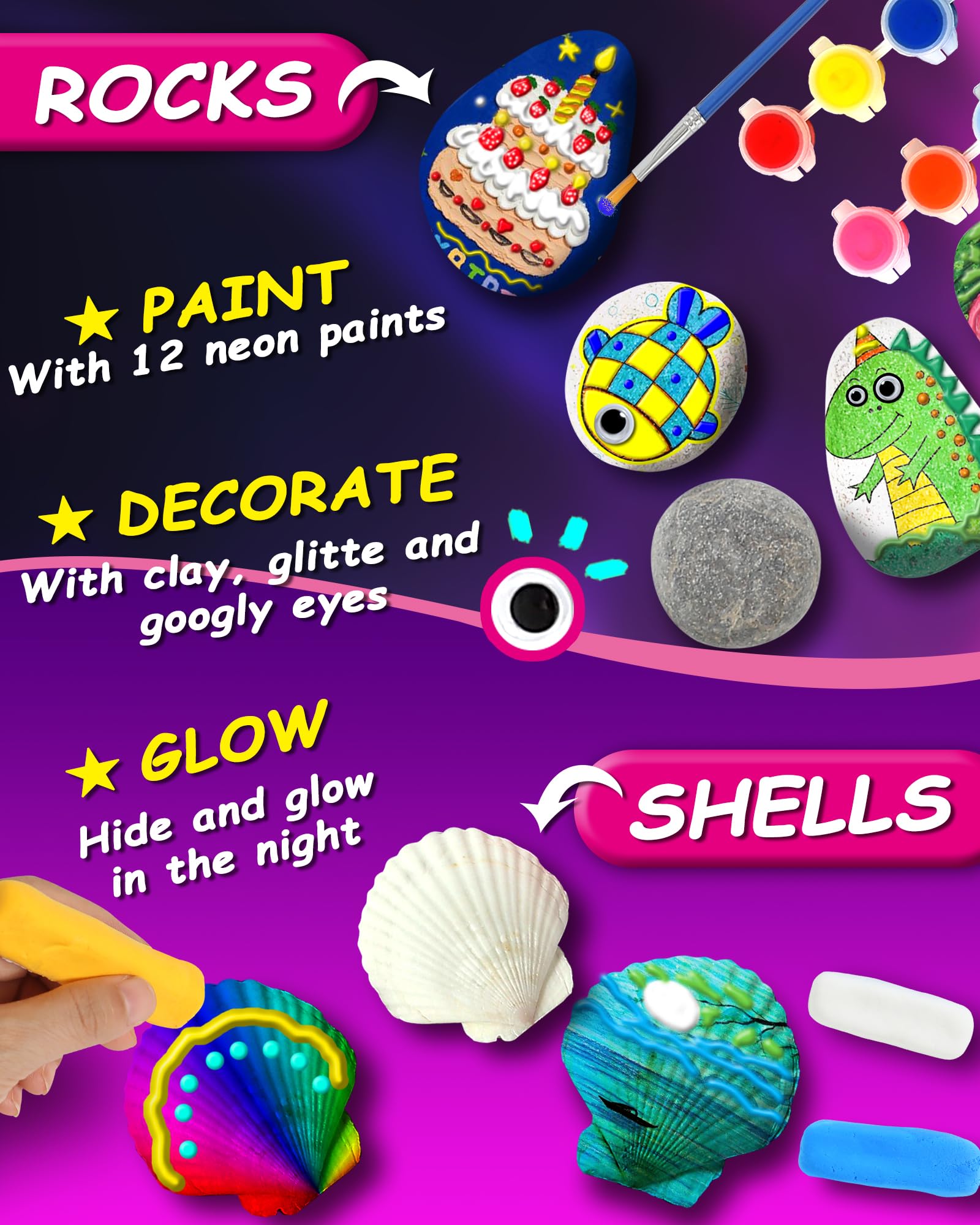 - Complete Crafting ExperienceWhether you’re a beginner or an experienced rock painter, the Glow-in-the-Dark Rock Painting Kit has something for you. The fine-tip paintbrush is great for precise lines, while the wider brush is perfect for larger areas. With the included clays&googly eyes, kids can get creative and add their personal touch to their rocks&sea shells.