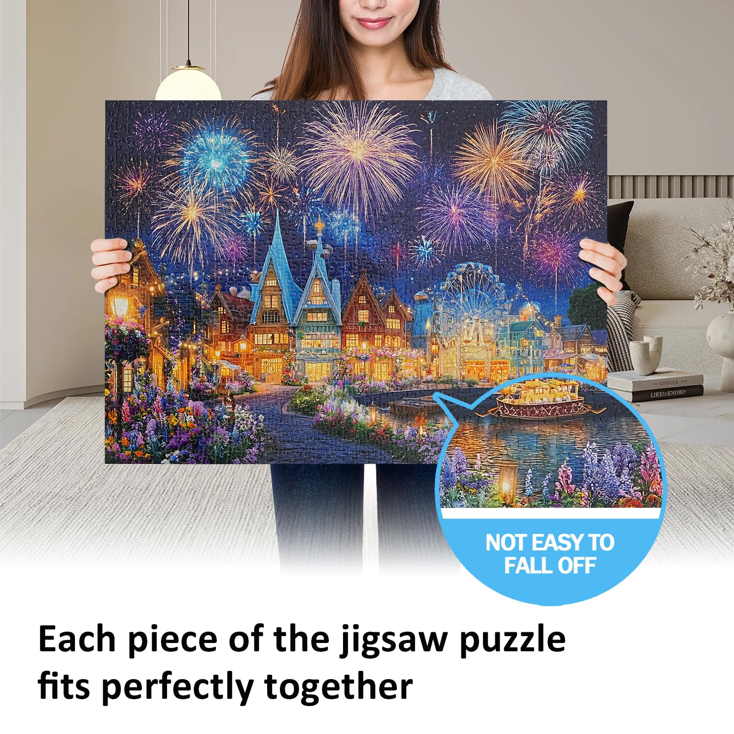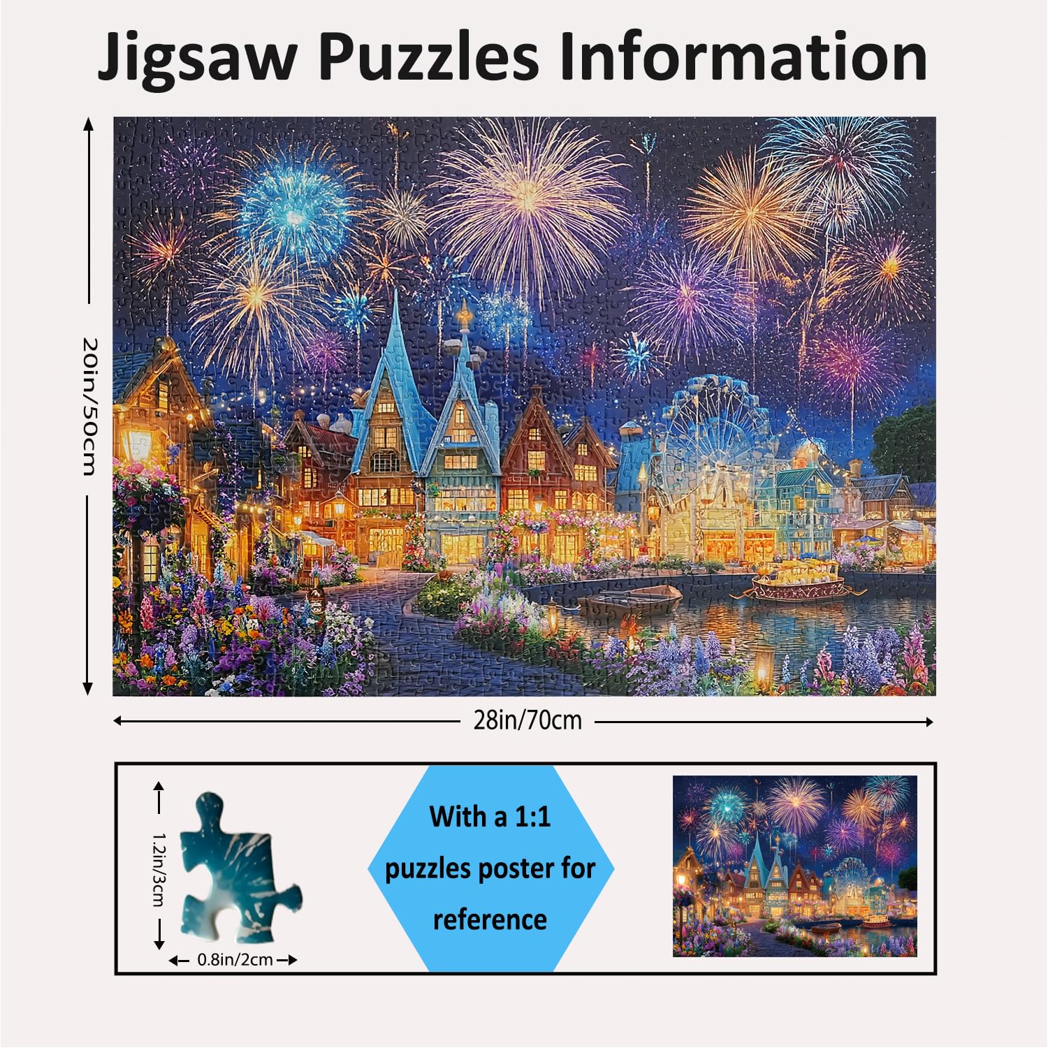 • 1000 piece puzzle for adults: Finished Size: 28*20* in / 70*50 cm. The packing box is sturdy and exquisite with a high-resolution poster to provide reference for Fireworks Festival Celebration puzzle art