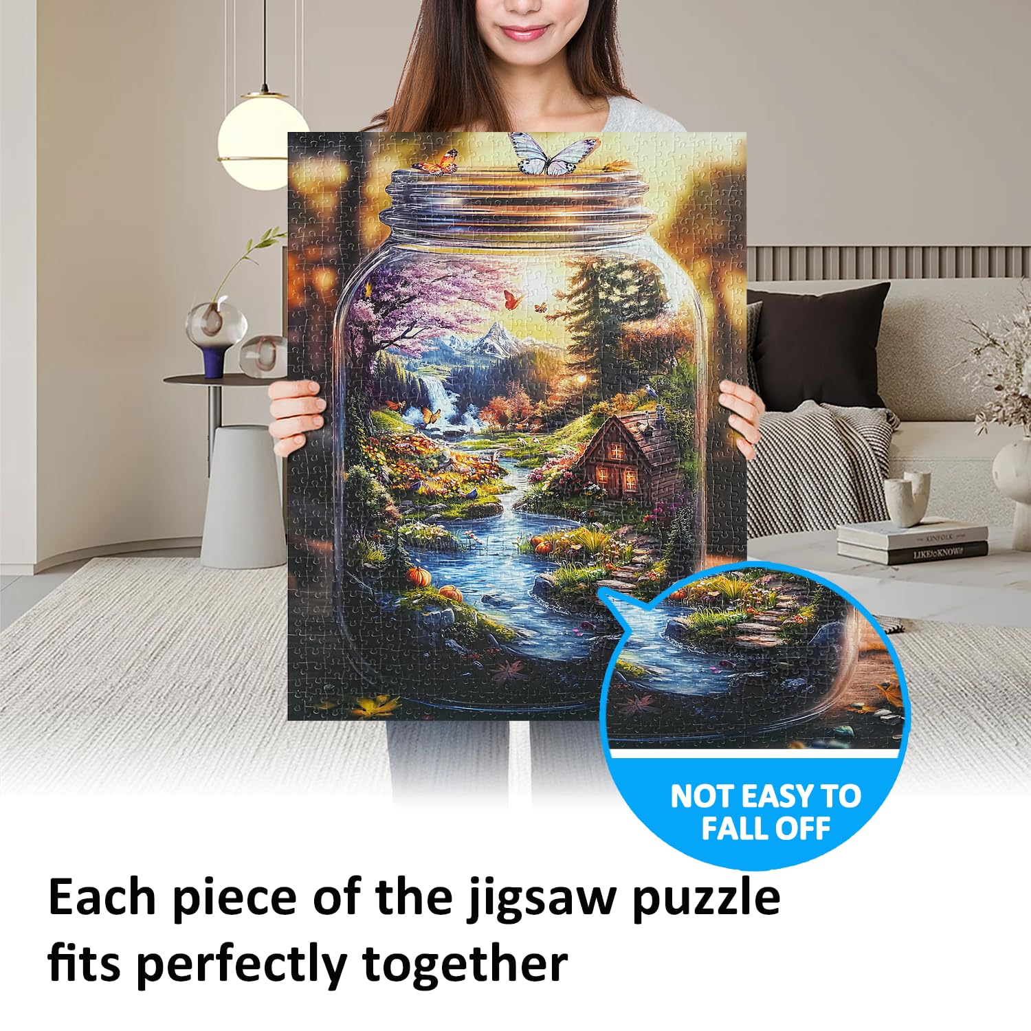 - 1000 piece puzzle for adults: Finished Size: 28*20* in / 70*50 cm. The packing box is sturdy and exquisite with a high-resolution poster to provide reference for World in a Bottle Nature’s Dream puzzle art