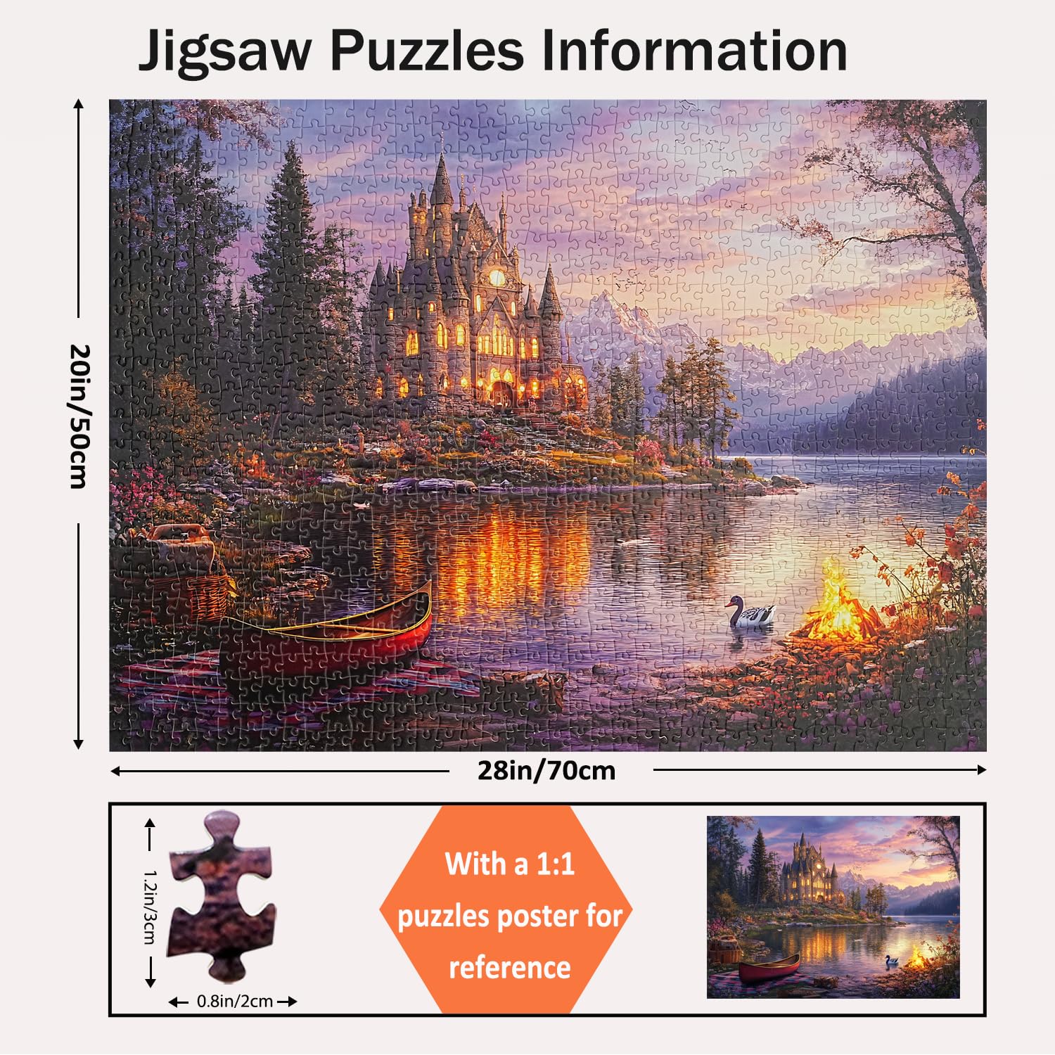 - 1000 piece puzzle for adults: Finished Size: 28*20* in / 70*50 cm. The packing box is sturdy and exquisite with a high-resolution poster to provide reference for Twilight Castle Reflections on The Lake Stories puzzle art