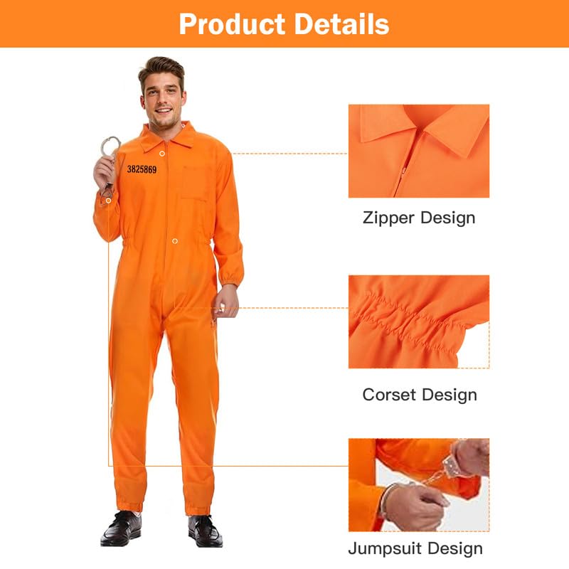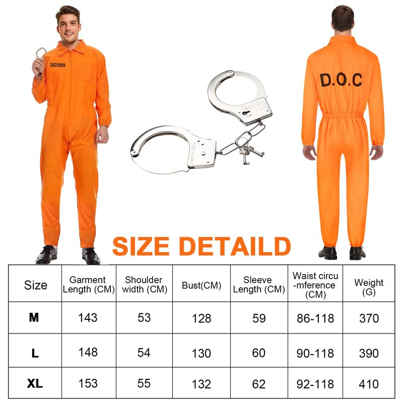 YushengTai Orange Prisoner Costume Set, Prisoner Jumpsuit with Handcuffs, Convict Costume Men and Women, Prisoner Costume, Party Outfit, Unisex Carnival Fancy Dress, M