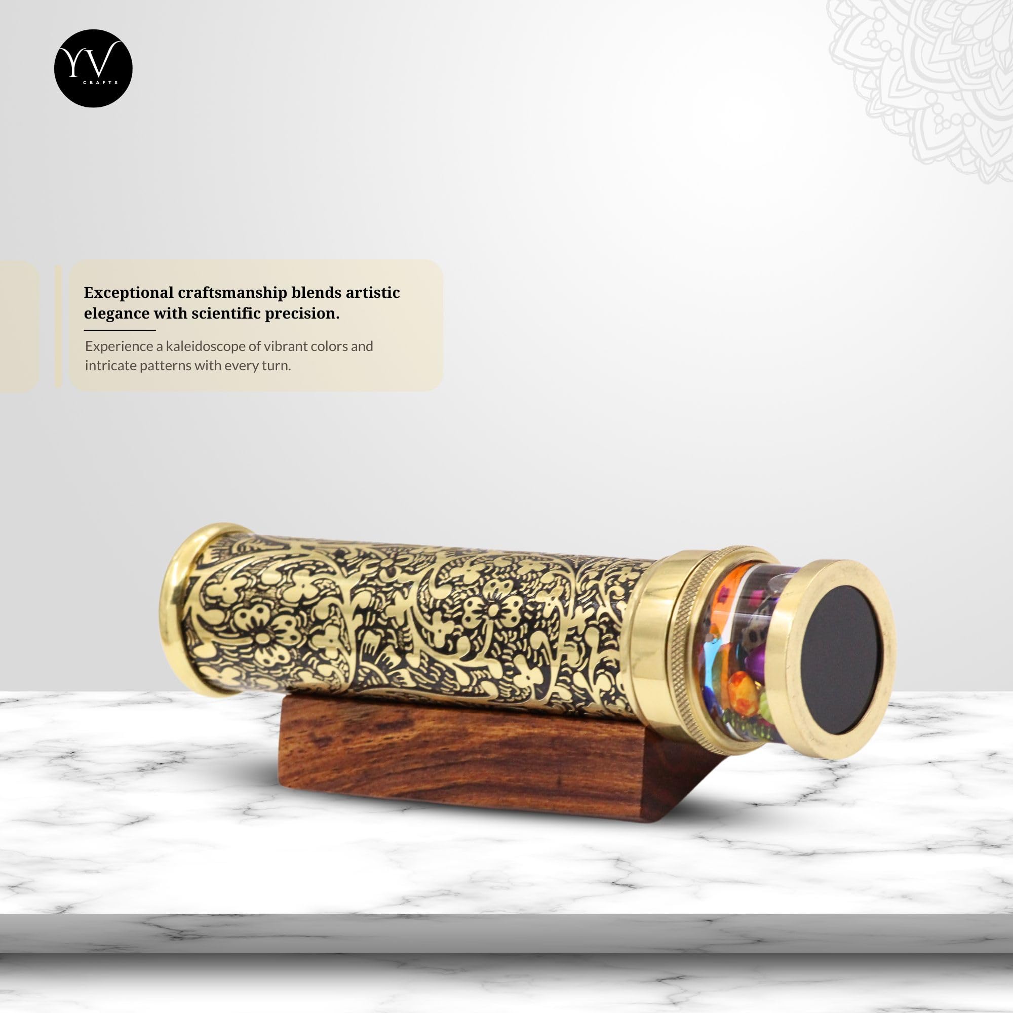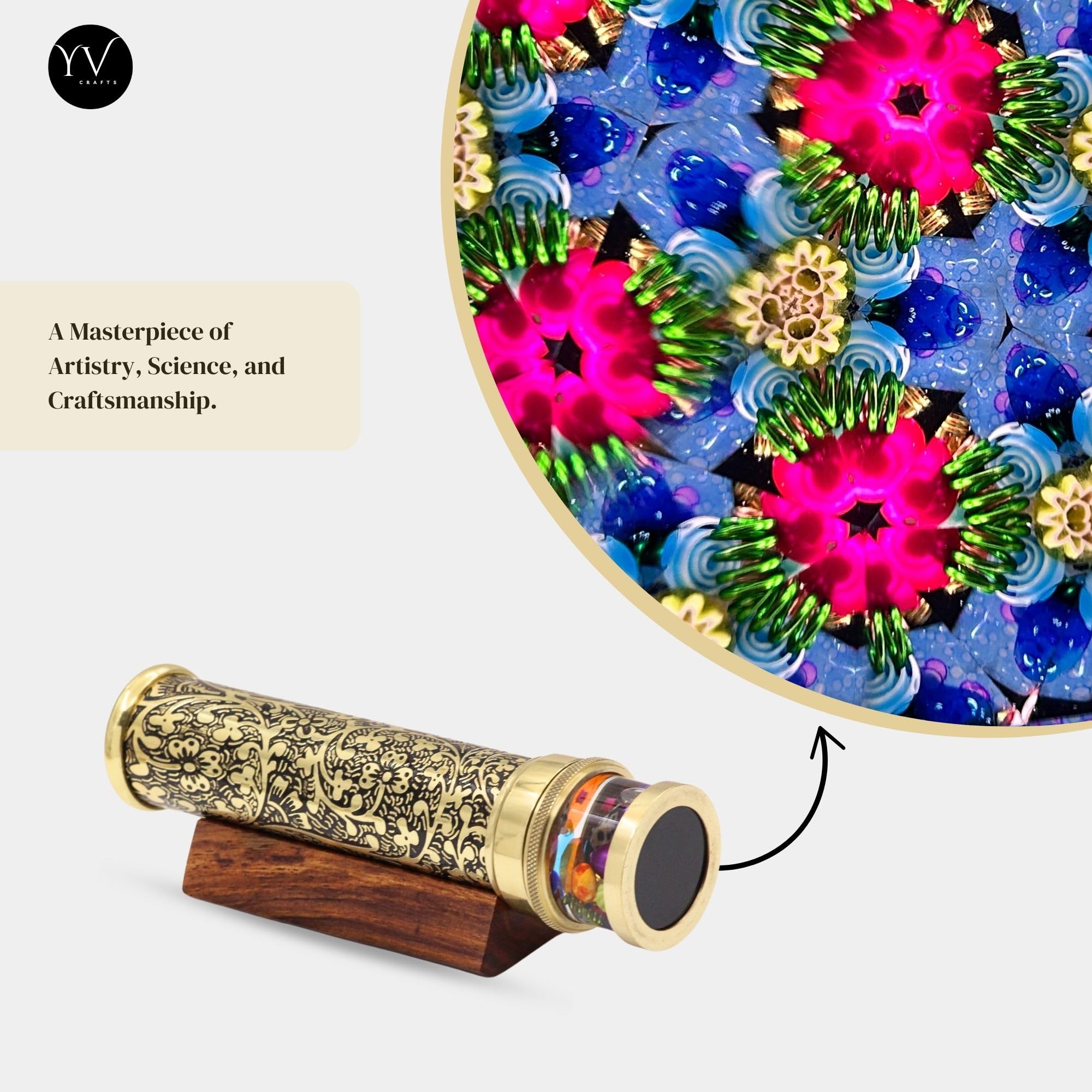 A Masterpiece of Artistry, Science, and Craftsmanship The “Giant Brass Floral Gardens Oil” Kaleidoscope, designed by USA artist Karl Schilling and newly released in 2024, is a stunning blend of artistic elegance and scientific precision. This kaleidoscope is a testament to exceptional craftsmanship, meticulously created using handcrafted brass by skilled artisans in India. Featuring a beautifully acid-etched brass barrel with intricate floral designs, a black patina finish, and a protective lacquer coating, this piece is built to last and dazzle for generations. At its heart, this kaleidoscope boasts a three-mirror system that creates mesmerizing, infinite patterns of vibrant colors. The separate oil-filled cell allows smooth, seamless rotations, adding a soothing and dynamic touch to the viewing experience. Completing the design is a solid wooden base for elegant display, making this kaleidoscope a collectible treasure for enthusiasts and art lovers alike.