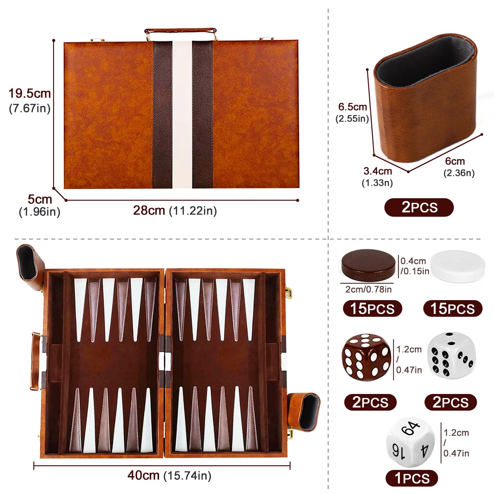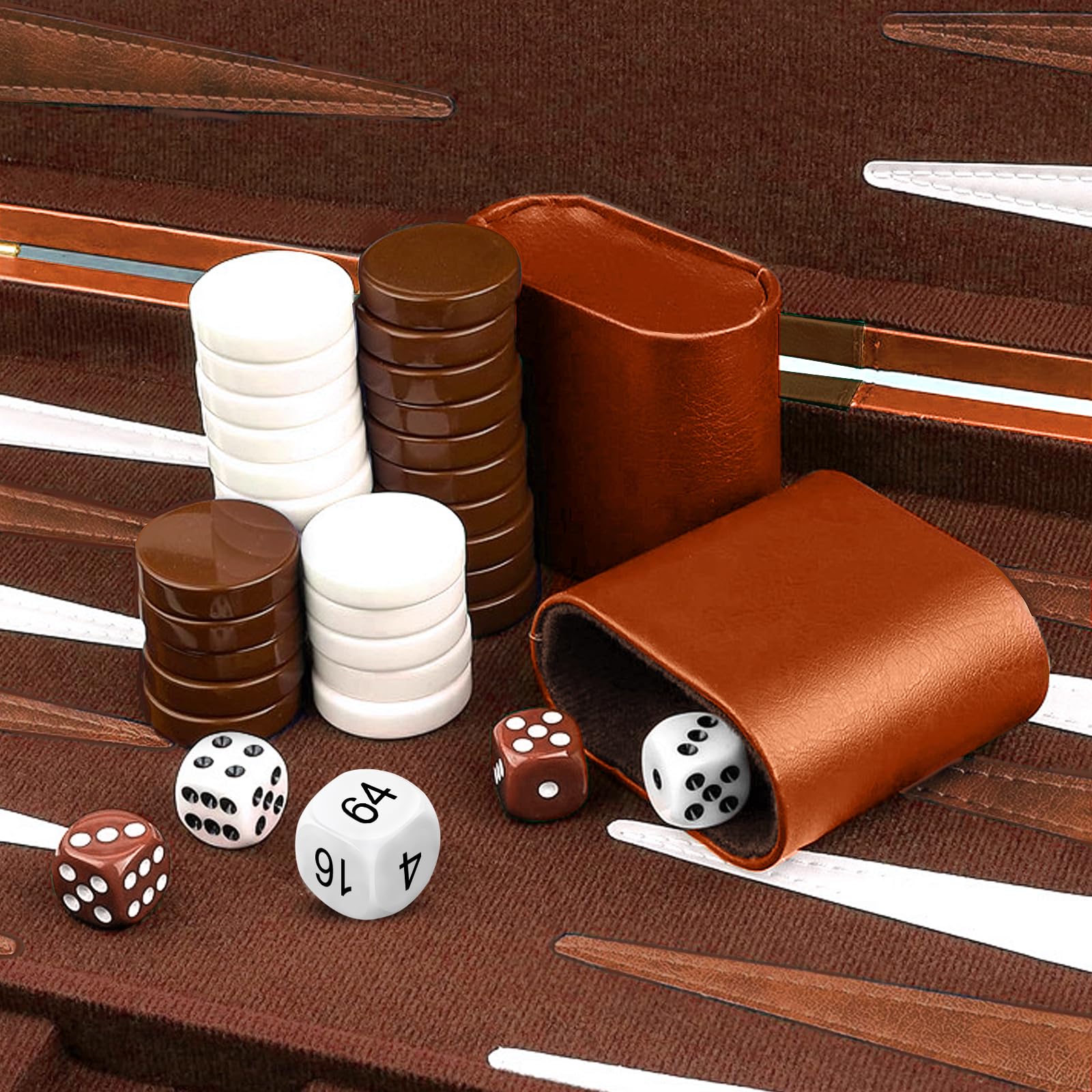 Package Included: This leather backgammon set contains everything you need for your gaming,included 1 x Backgammon Board + 30 x backgammon chips (15 of each colour) + 4 x regular dices + 1 x doubling dice + 2 x dice cups.