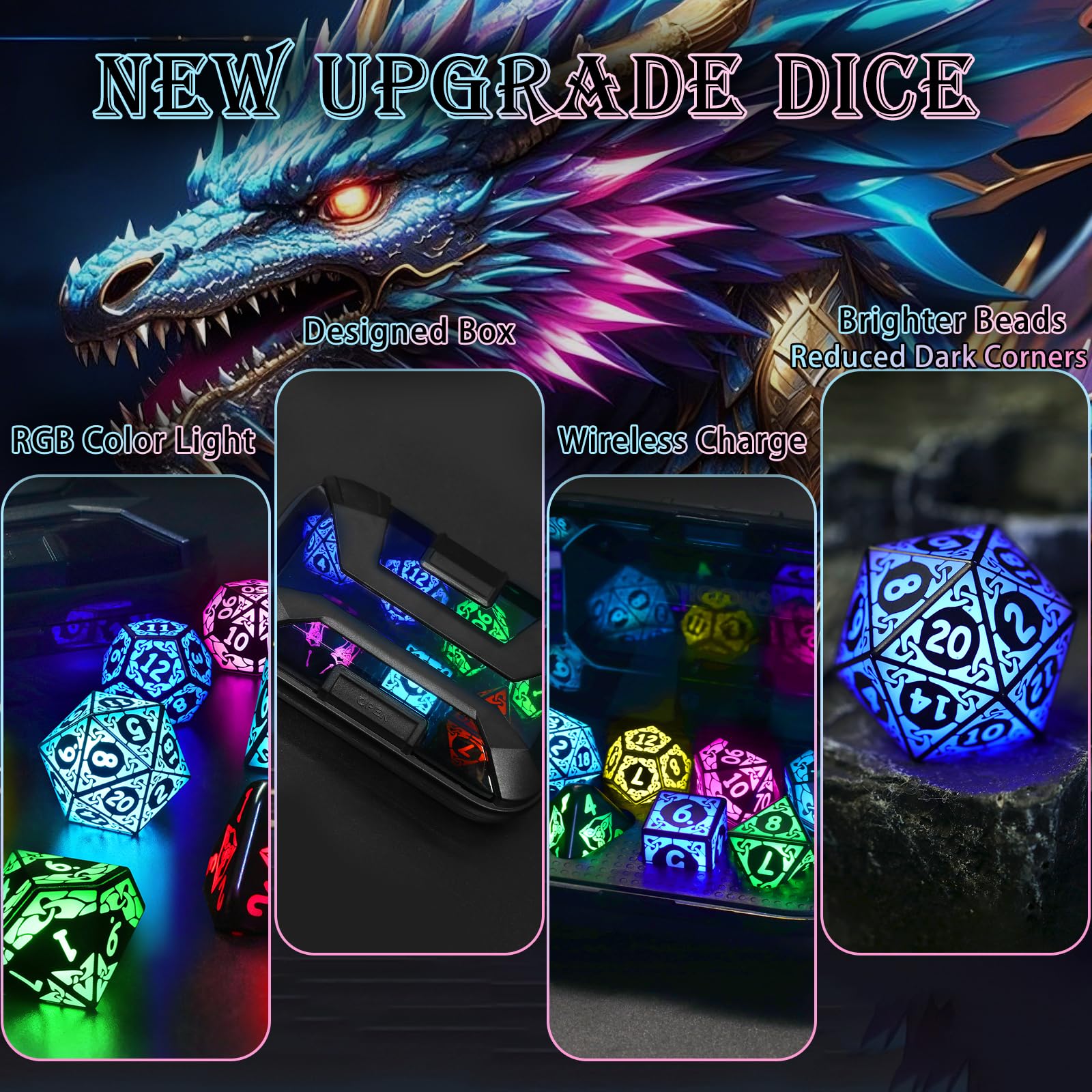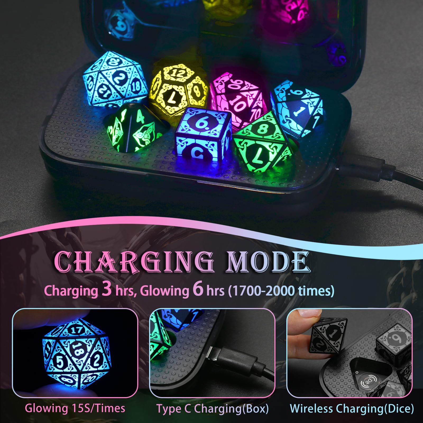 Step into a world of vibrant colors with our dnd dice. Not only do they light up in a mesmerizing spectrum of hues, but they also charge wirelessly, ensuring you’re always ready for the next game nigh