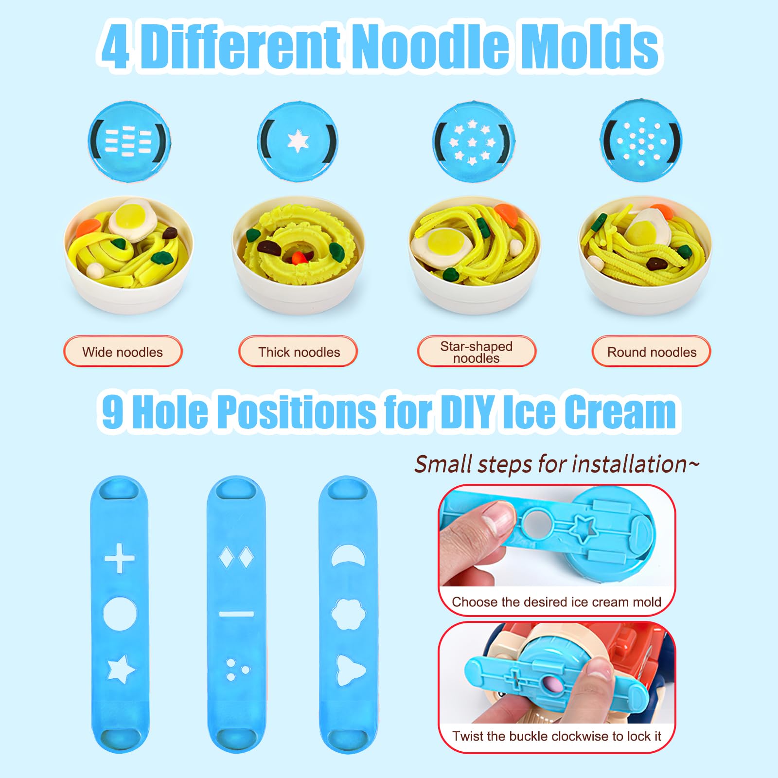 - Creative Design: This kid-friendly kitchen dough accessories tools features a fun car model that pleasant music. Beyond standalone use, it can craft noodles in various shapes and includes 9 DIY ice cream molds. Packed with abundant kitchen accessories, it inspires children’s imagination, letting them design unique food-themed creations
