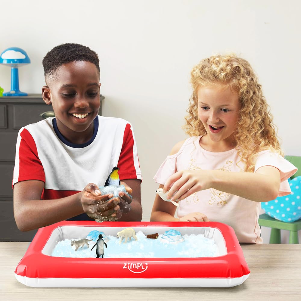 ZIMPLI Sno Adventures Arctic Pack, 5 Use, 8 x Arctic figures, Inflatable Play Tray, Imaginative Sensory Playset, Artificial Fake Snow Toy, Xmas Gift for Kids