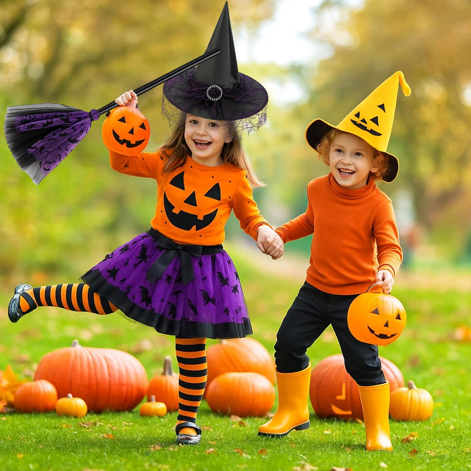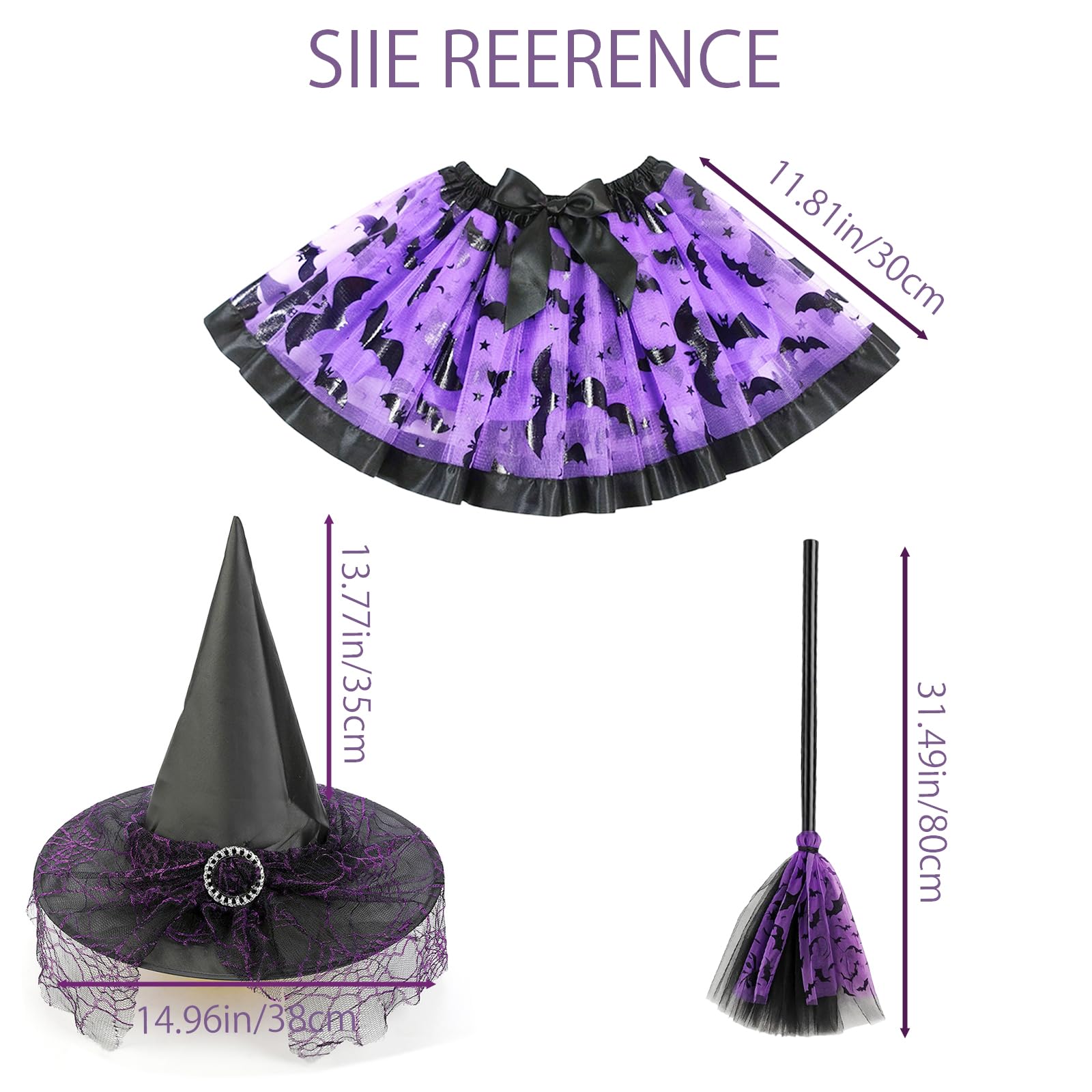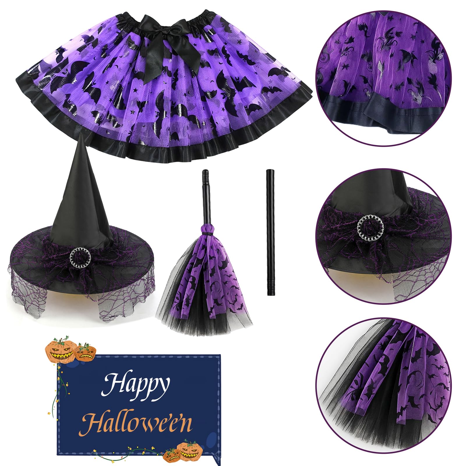 • 3-Piece Witch Costume for KidsThis complete witch costume kids set includes a purple tutu skirt, witch hat, and broom everything your child needs to become a magical little witch this Halloween!