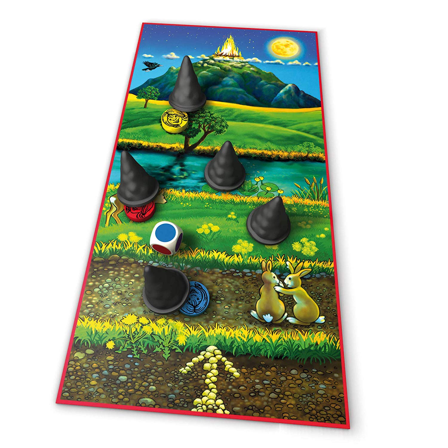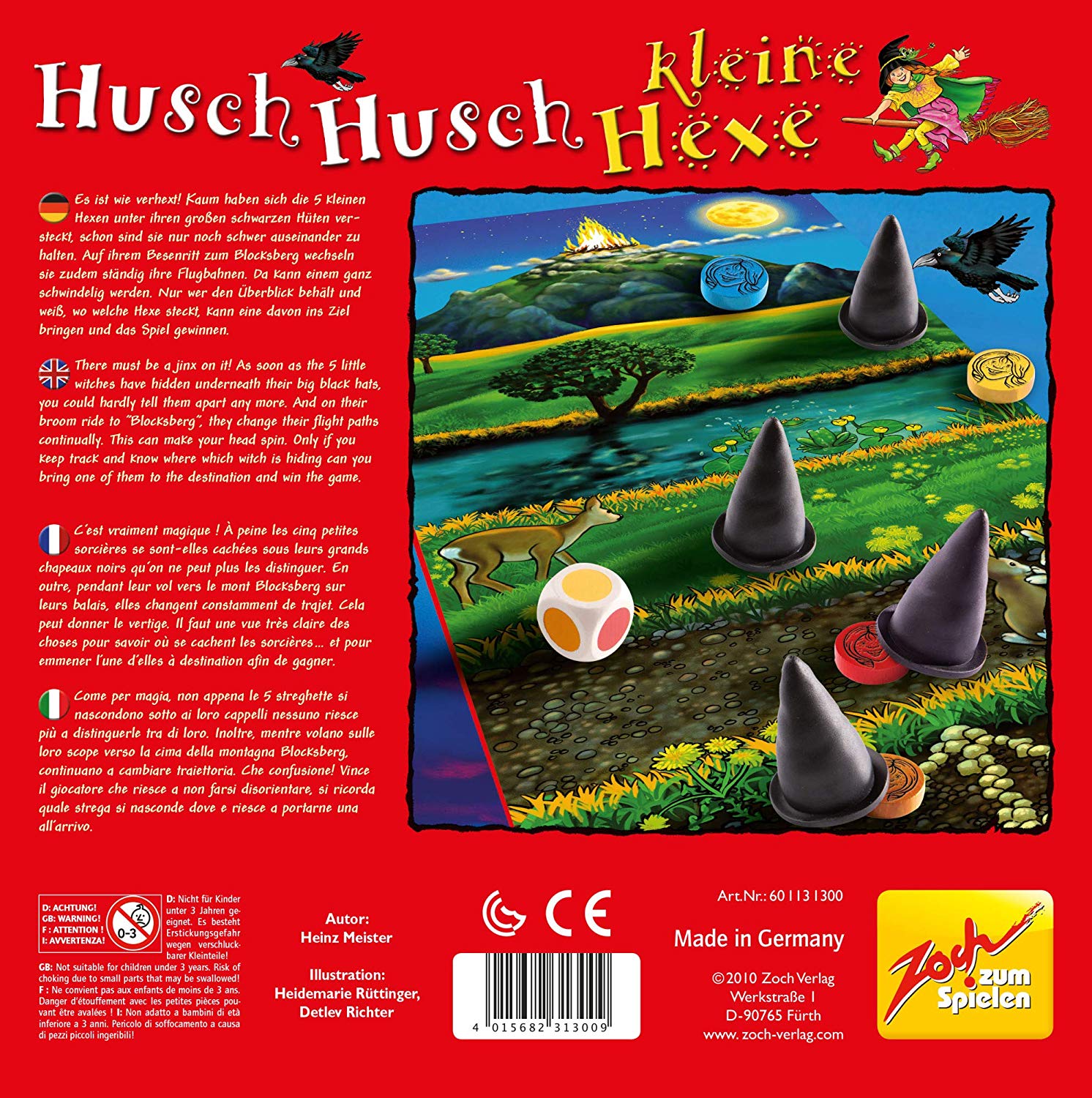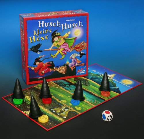 Husch Husch kleine Hexe Husch Husch kleine Hexe is a classic among the memory games for the youngest age range. The little witches set off for their flight to the Blocksberg, but since they are not allowed to be seen there by the old witches, they hide under their long black witch hats. The player who is the first to land on the Blocksberg with one of the witches wins. for 2 to 6 Players, Ages 3 and up