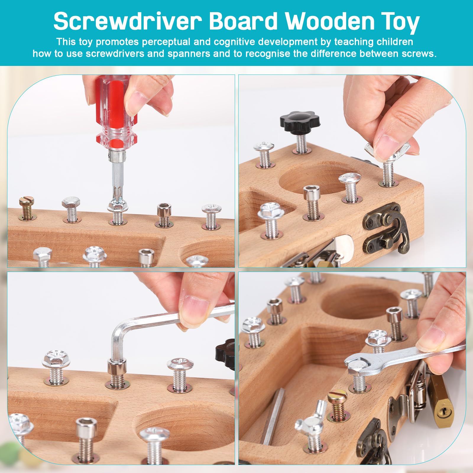 - Montessori Screwdriver BoardThe screwdriver board contains 7 different types of screws, 1 spanner, 1 lock, 2 spanners, 1 combination screwdriver, 1 Allen key and 1 wooden Montessori screwdriver board. The screwdriver provided is lightweight and all nuts and bolts fit into the screw holes on the board.