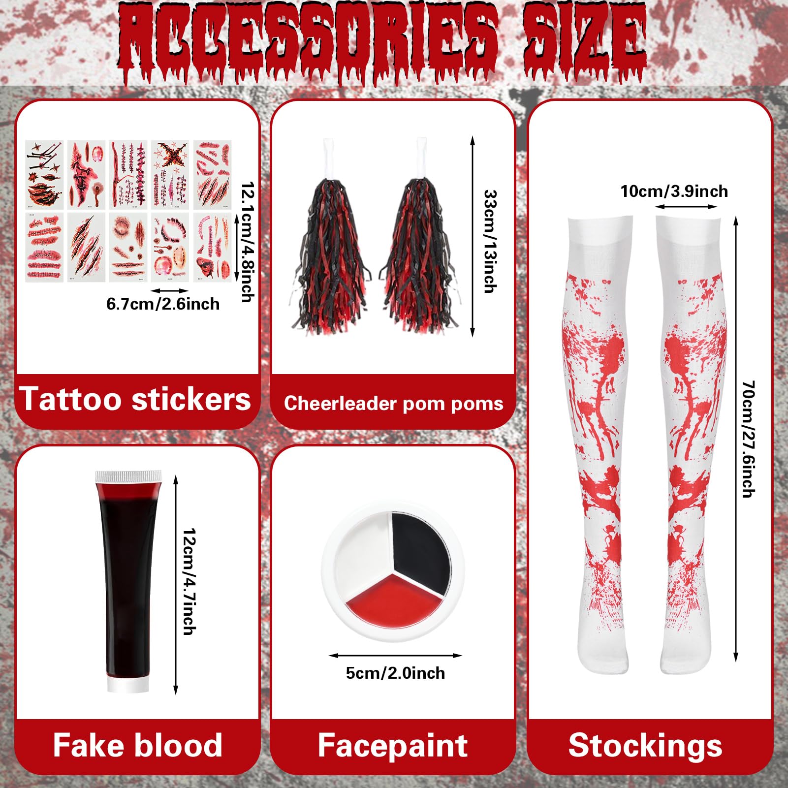 - School Zombie Costume Kids-This zombie cheerleader costume Including: cheerleader costume *1 + poms poms *2 + socks*2+ three color face paint*1+ fake blood *1 and scar tattoo stickers*10. You’re sure to get a grade A in being undead while wearing this zombie school costume.