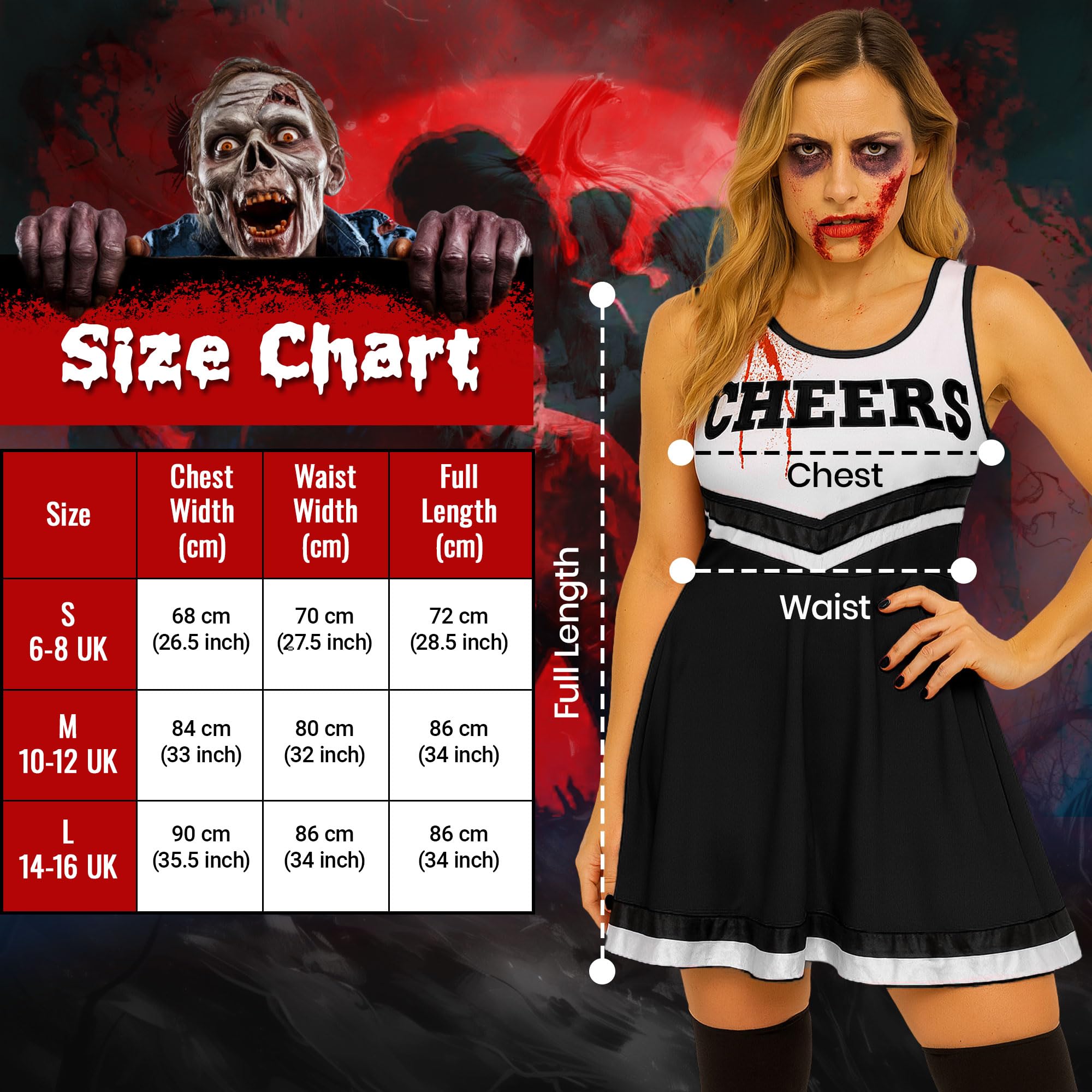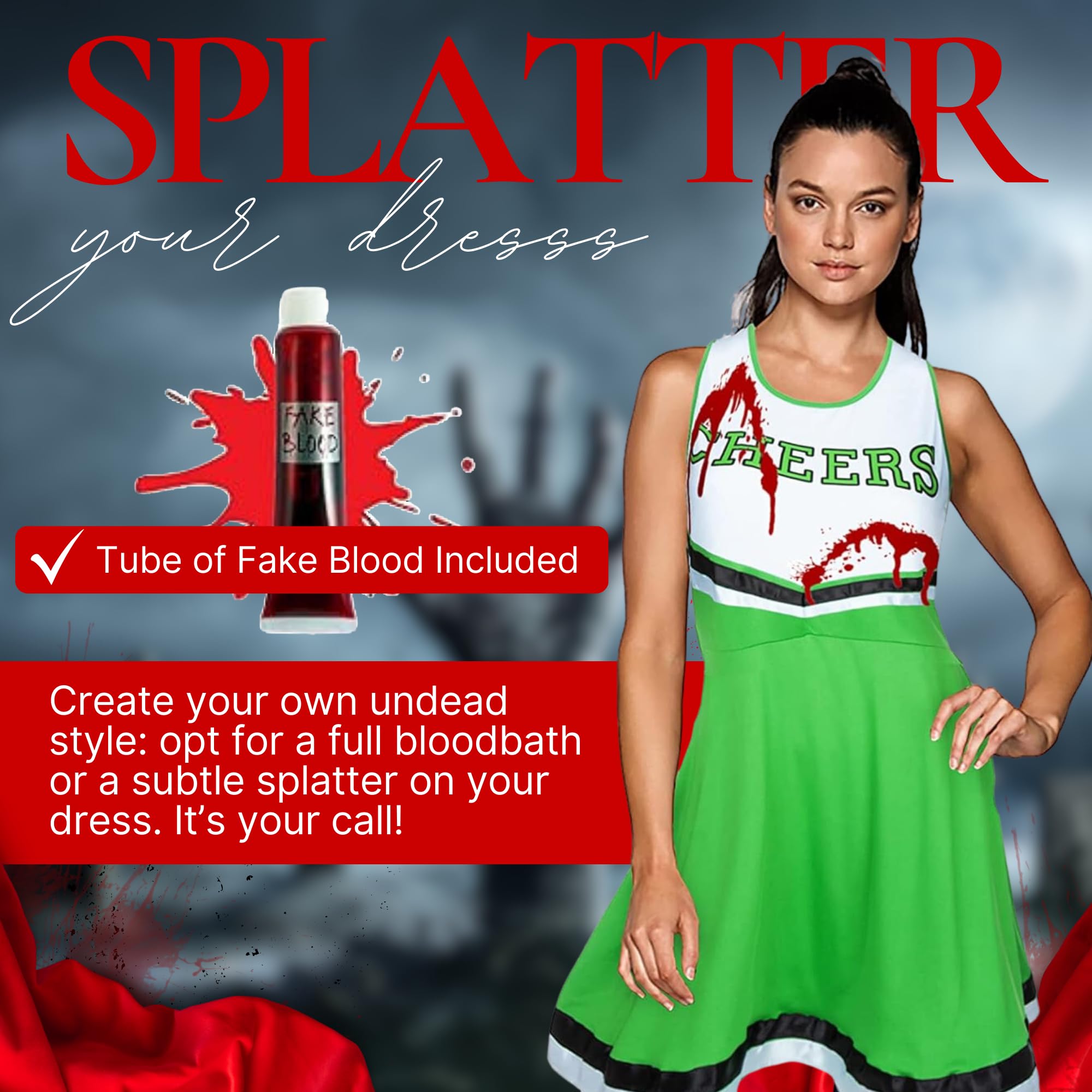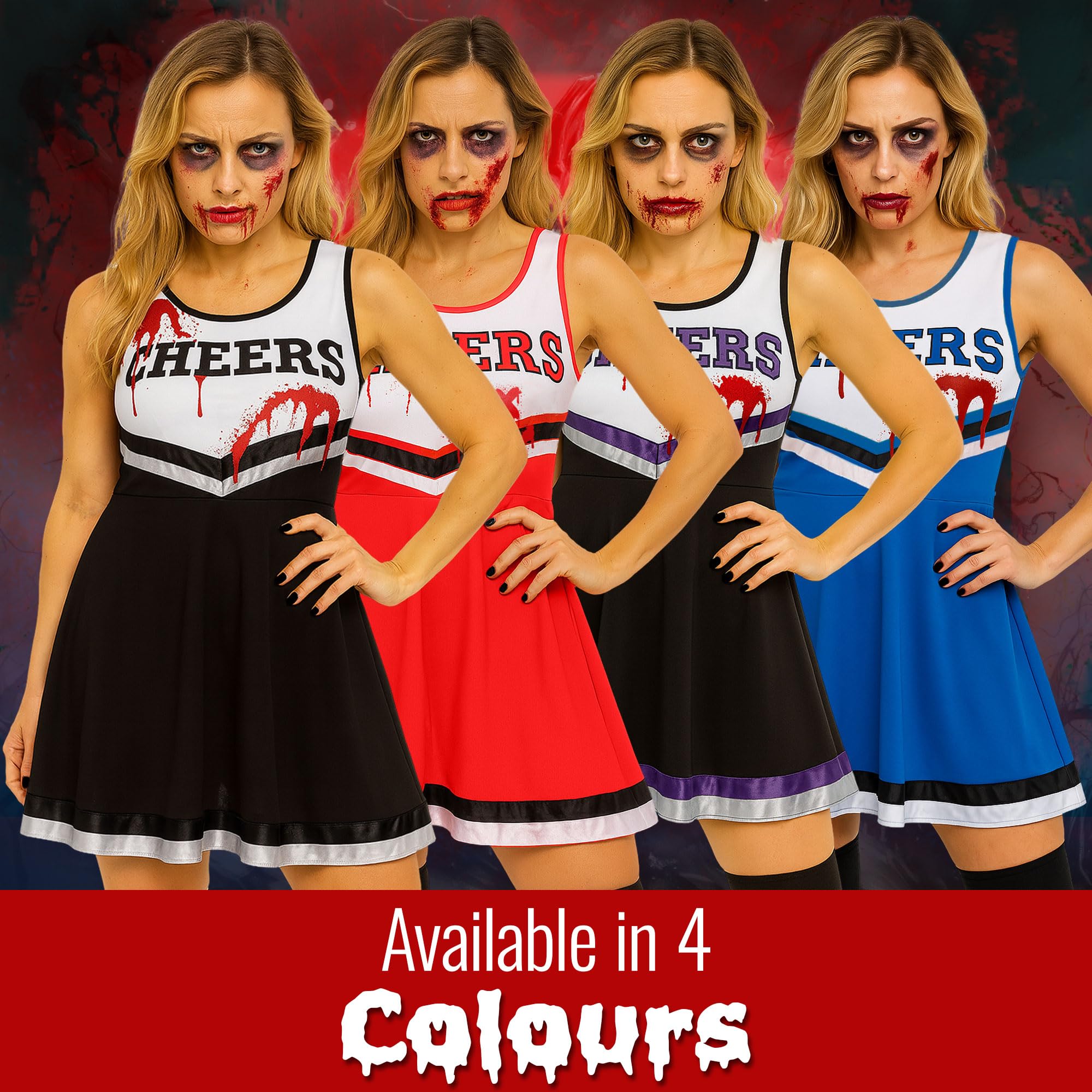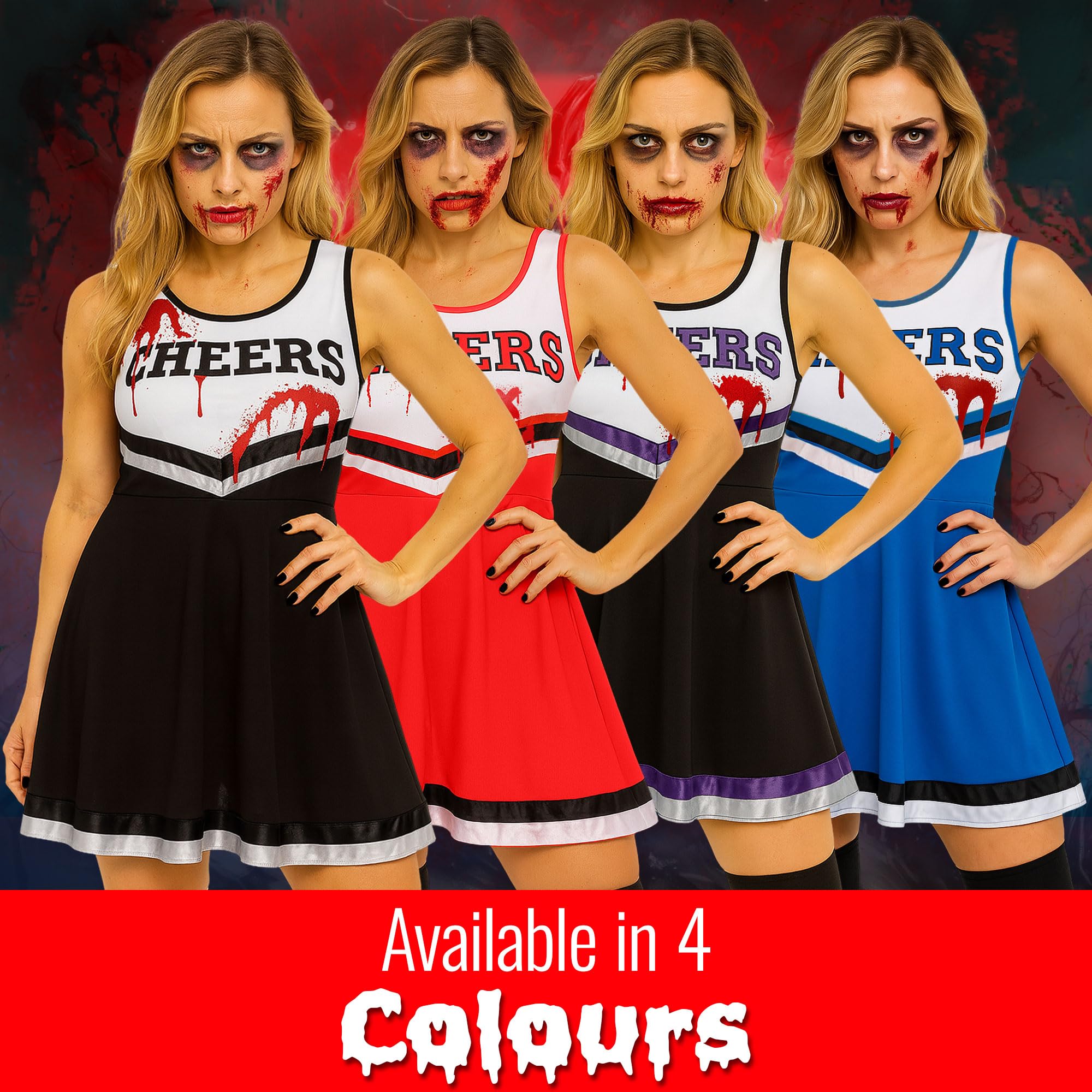 - Cheerleader Costume Women; There are 6 colours of cheer costume to choose from, each cheerleading dress comes plain, use the fake blood to customise your dead cheerleader Halloween costume womens