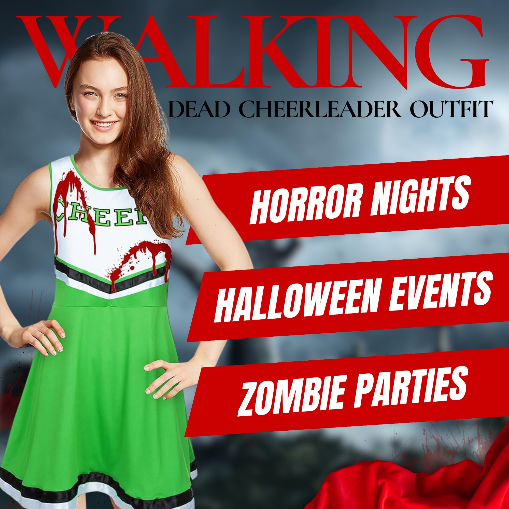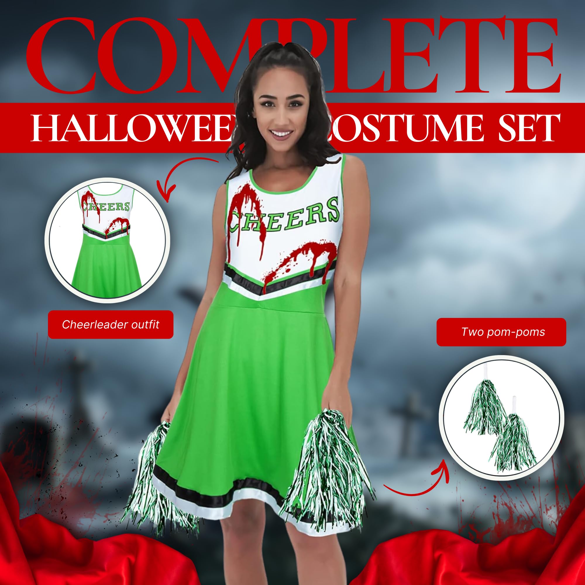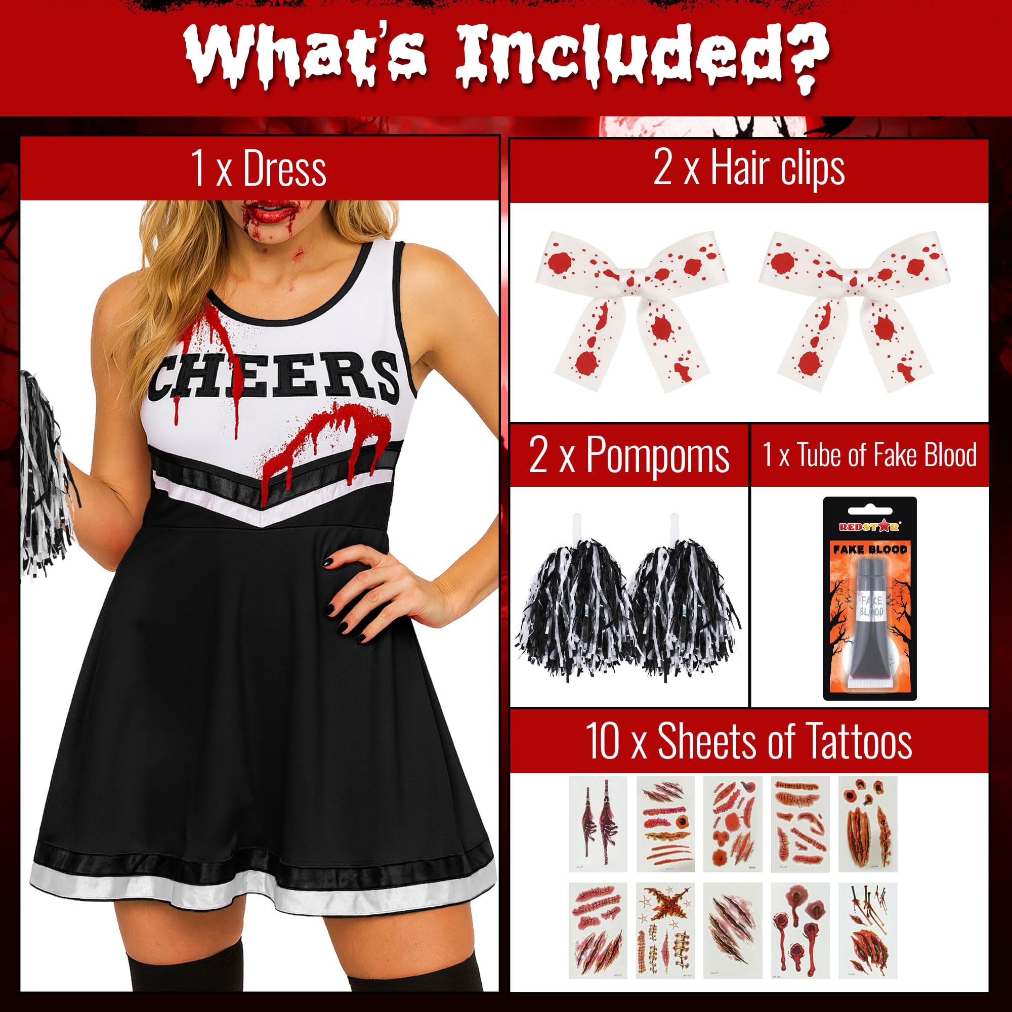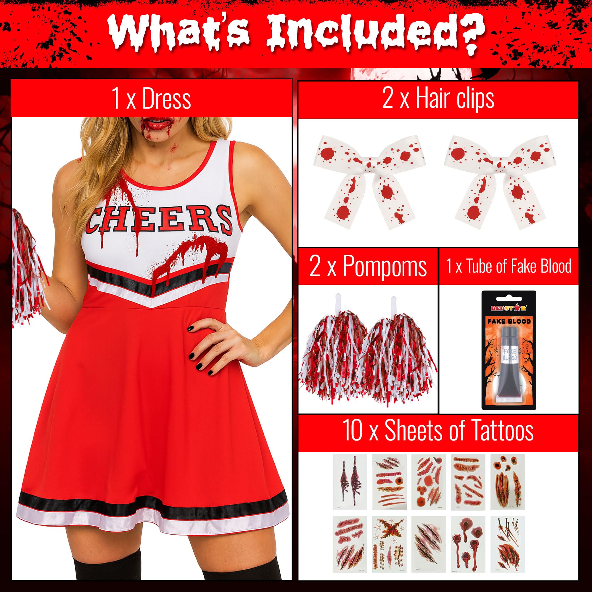 - Dead Cheerleader Halloween Costume Women; Set has cheerleader pom poms, cheerleader dress ,fake blood, 2 hair clips and 10 sheets of scar tattoos Halloween to make a dead cheerleader costume Halloween