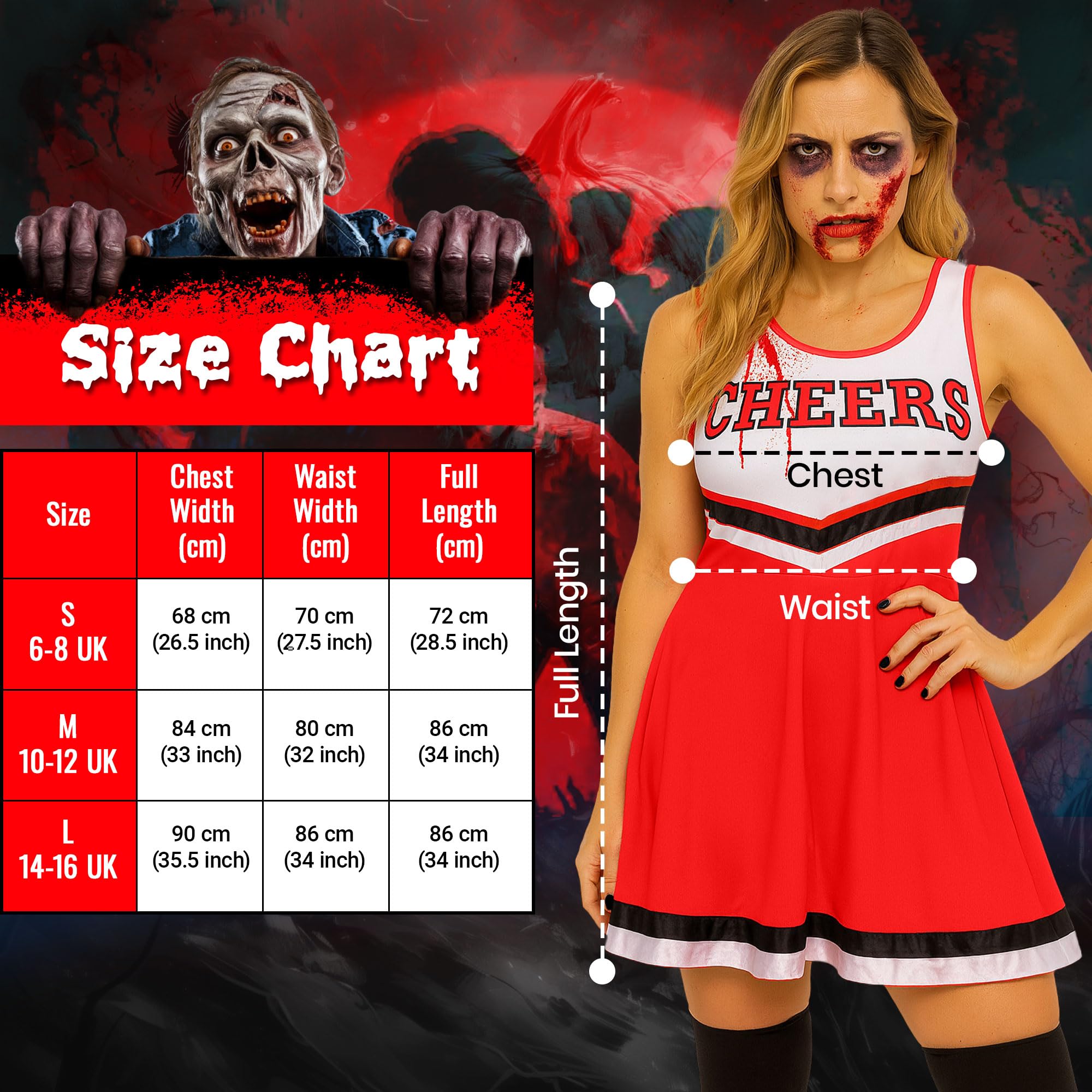 - Womens cheerleader costume; A womens cheerleader outfit with cheerleader pom pom and zombie scar tattoos, need a scary zombie cheerleader costume then this adult cheerleader costume is for you