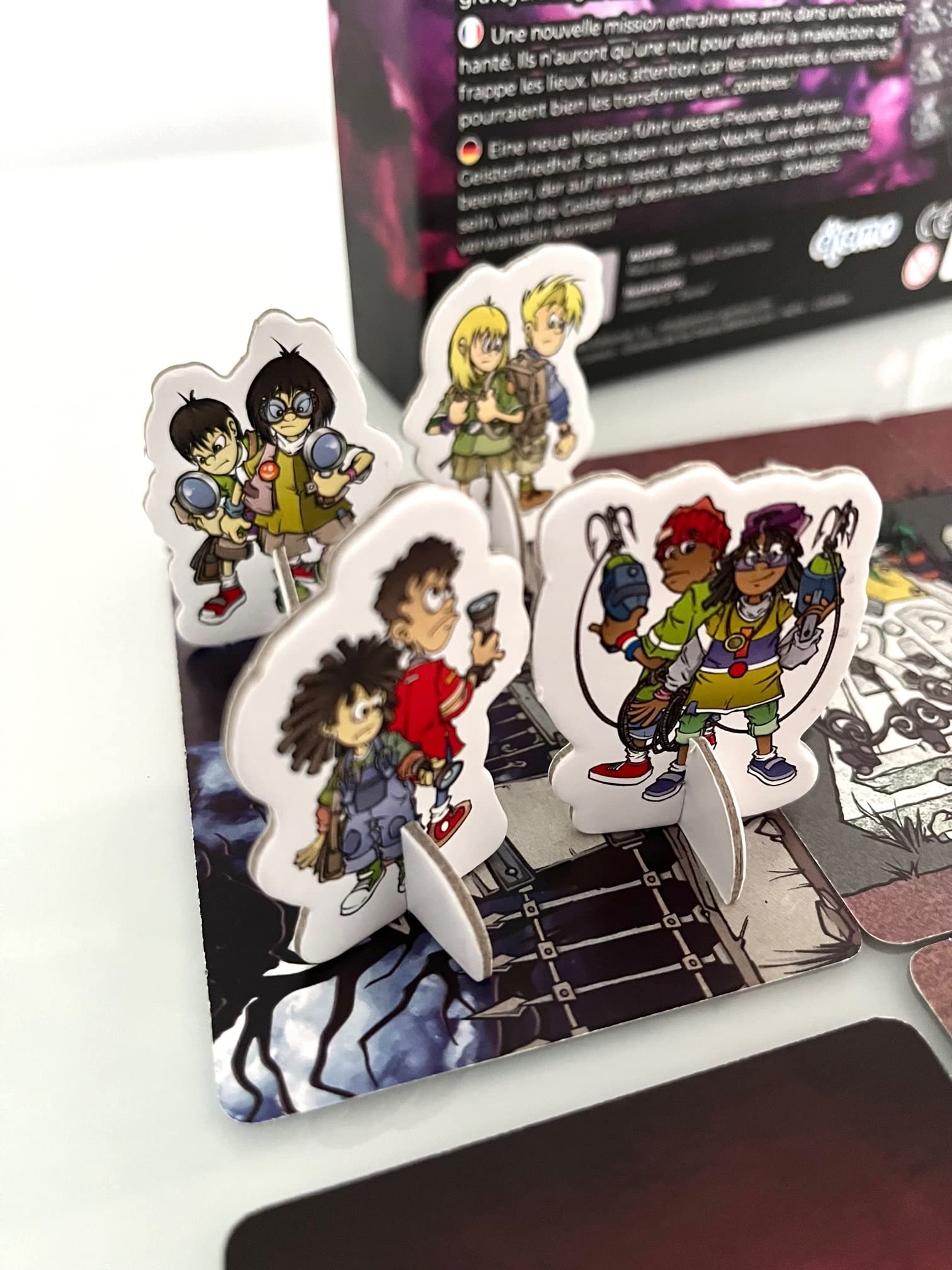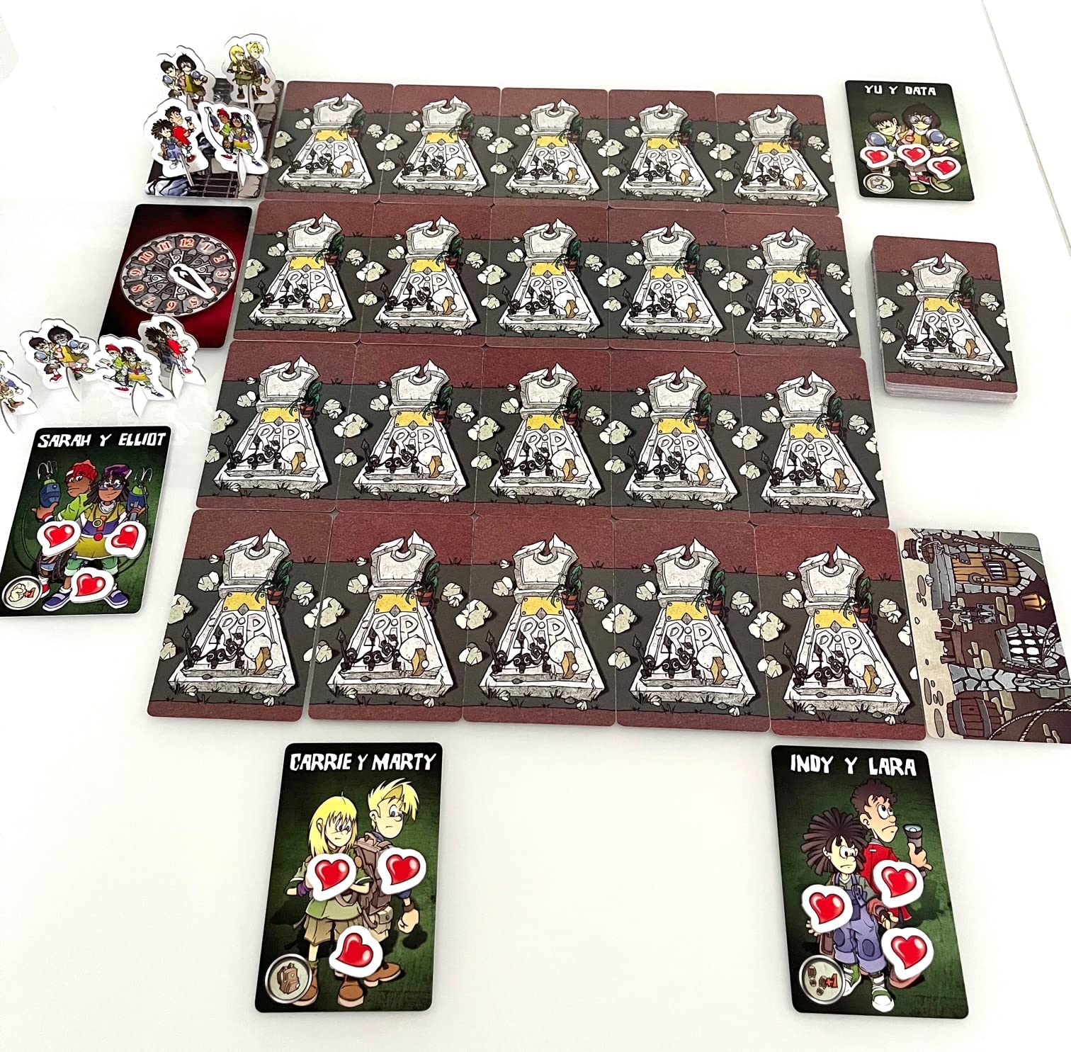 - CONTENT: A deck of large tomb cards. 4 x Kids Couples Dies 4 x Zombie Kids Couples Dies 1 x 6-sided die. 12 life counters. A watch letter with a needle. Character cards. Instructions in 4 languages: ES-EN-FR-GE