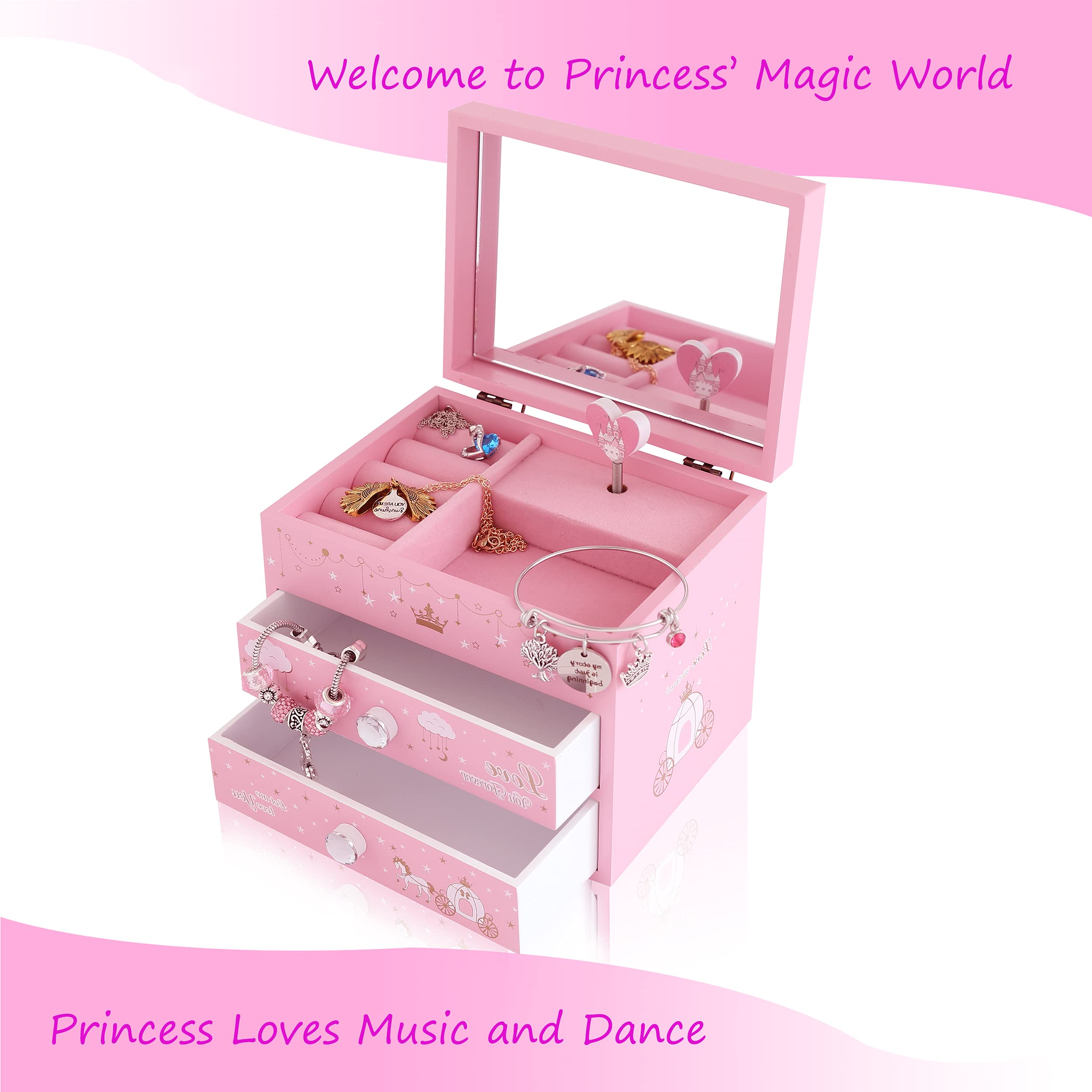 ZOOWING Girls Musical Jewelry Box Toys Gifts with Full Size Mirror and Unicorn Jewelry Set (A-Princess1)