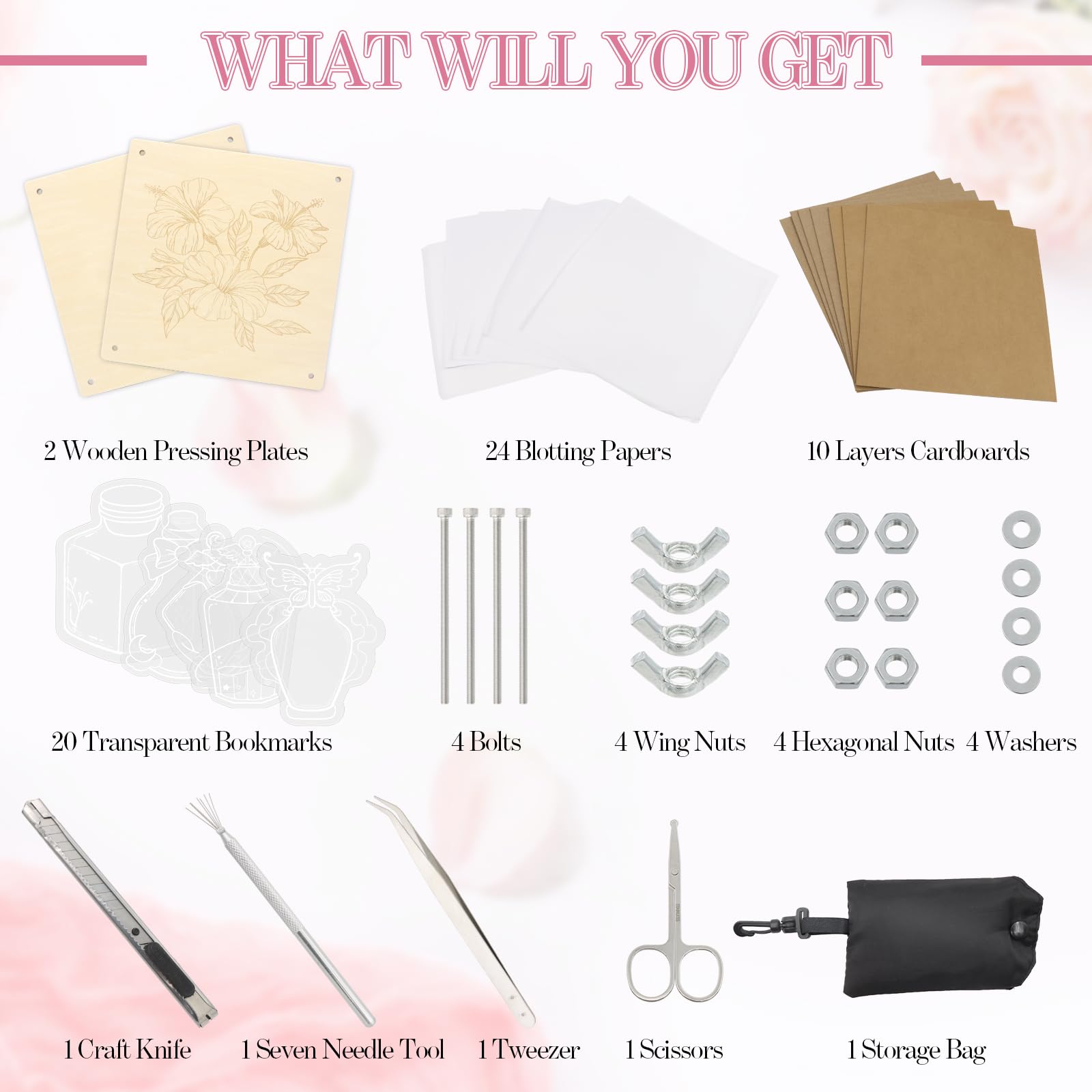 - [All-in-1 Flowers Press Kit]: Kit includes 2 Wooden Pressing Plates, 10 Layers Cardboards, 24 Blotting Papers, nuts, washers, bolts, scissors, tweezers, craft knife, needle tool, all the accessories you need are included, no need to buy extra! In addition, there are 20 transparent bookmarks for you to DIY freely!